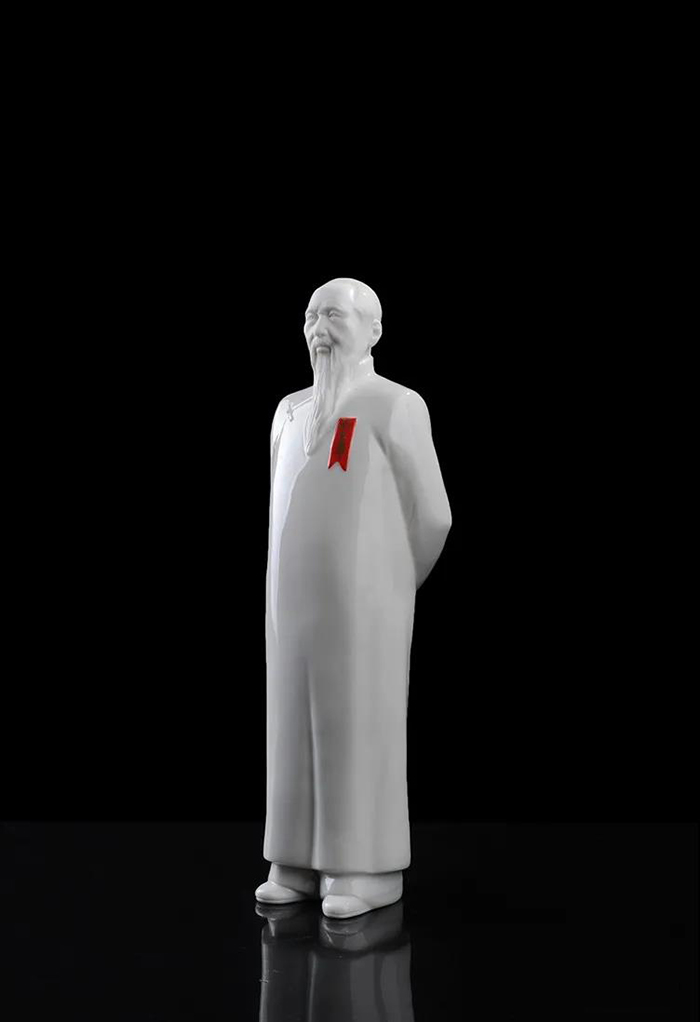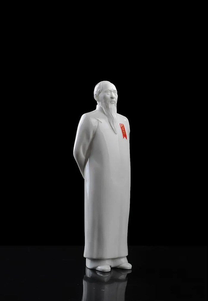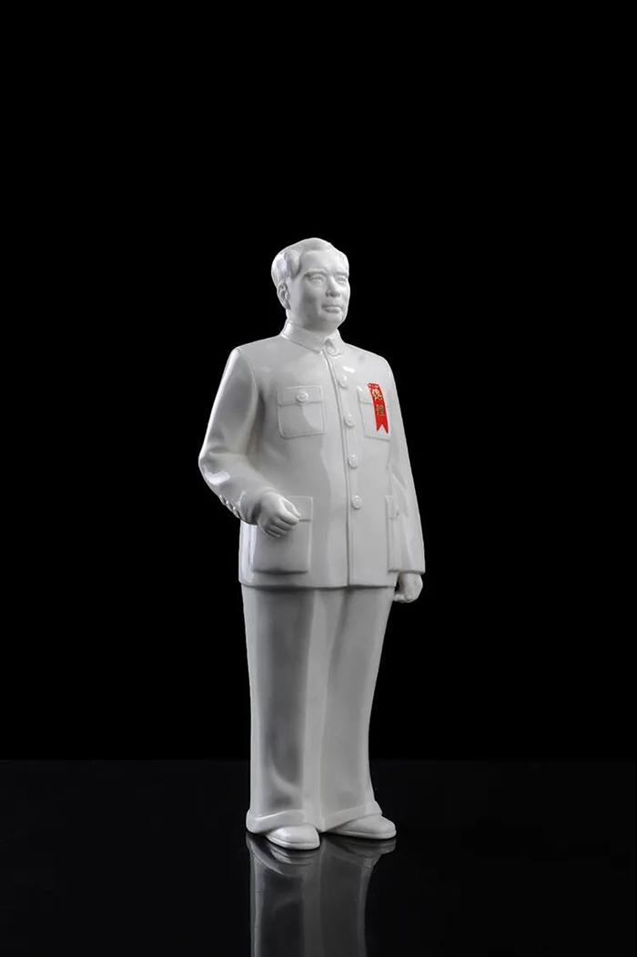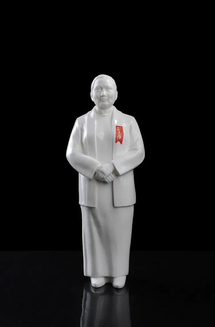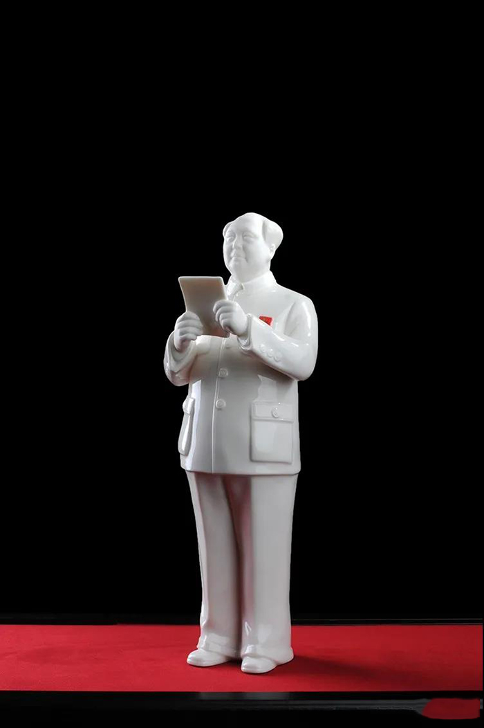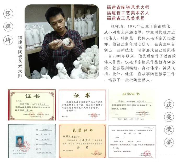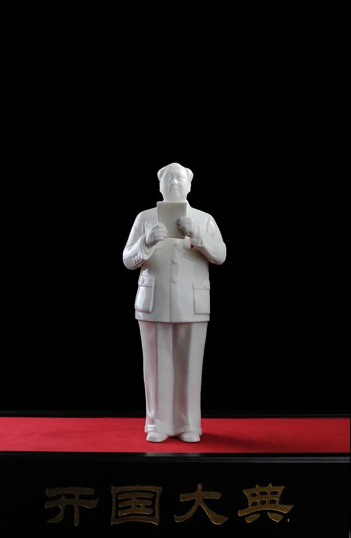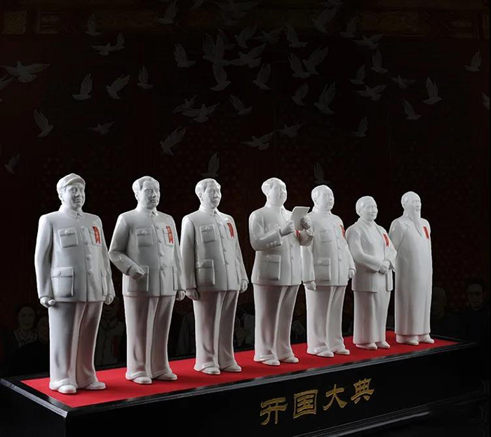 《開國大典》由福建省工藝美術(shù)大師張祥琦創(chuàng)作,作品以德化特有的“中國白”瓷泥為材料,采用寫實與概括相結(jié)合的表現(xiàn)手法,歷時近一年才創(chuàng)作完成。人物高30厘米,從左到右依次是:朱德、劉少奇、周恩來、毛主席、李濟深、宋慶齡、張瀾。整組作品人物形象惟妙惟肖、栩栩如生,眼睛正視前方,神情堅定,從容而莊重,極具神韻。藝術(shù)再現(xiàn)了1949年10月1日,毛澤東與開國元勛們站在天安門城樓上,由毛澤東宣布中華人民共和國成立的壯麗情景。