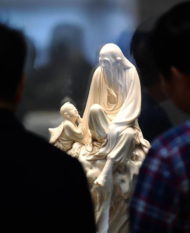 ↑12月16日,觀眾在欣賞首屆德化“中國白”中國傳統(tǒng)陶瓷藝術雙年展的特等獎作品《紫氣東來》。