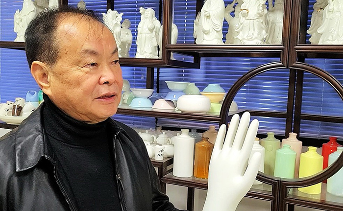 疫情讓福建省玉瓷發(fā)展股份有限公司董事長溫克仁找到了新商機(jī)。在他的辦公室里,記者看到桌上和地上擺放著好幾個陶瓷手模。