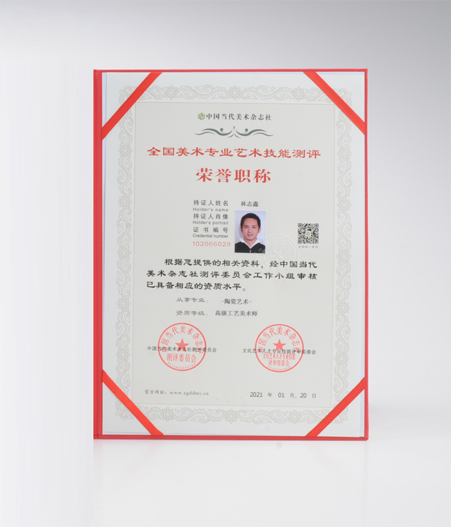 林志鑫,高級工藝美術師、福建省工藝美術師、中國陶瓷藝術文化發(fā)展中心會員,德化縣融匯之家陶瓷有限公司藝術總監(jiān)。1992年9月 出生于“中國瓷都德化”,從小深受瓷都德化陶瓷文化熏陶 ,酷愛陶瓷雕塑,手拉胚、紫砂制壺等,大學畢業(yè)后回瓷都德化從事紫砂制壺,陶瓷制作,2016年至2018年在德化縣博緣陶瓷從事陶瓷雕塑工作;2019成立德化縣融匯之家陶瓷有限公司專業(yè)從事茶具、茶壺、雕塑擺件創(chuàng)作生產(chǎn)銷售。經(jīng)過多年的學習創(chuàng)作,林志鑫熟練掌握陶瓷雕塑、燒制等技藝等,多件作品在國內評比榮獲金銀獎。