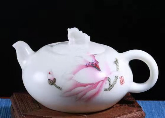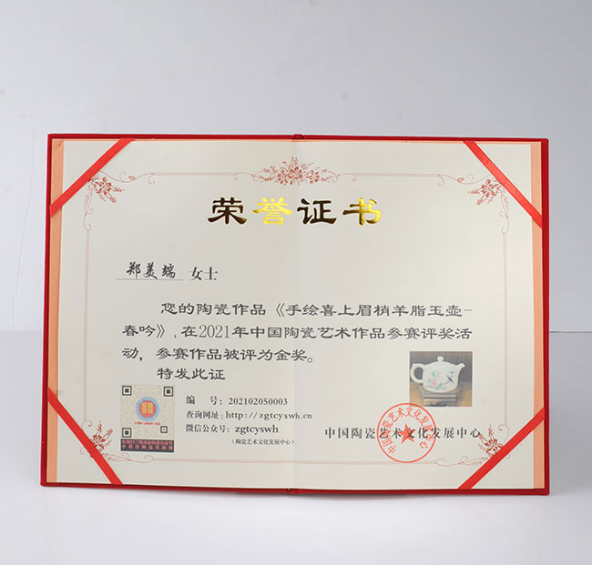 作品《手繪喜上梅梢羊脂玉瓷壺》榮獲金獎(jiǎng)