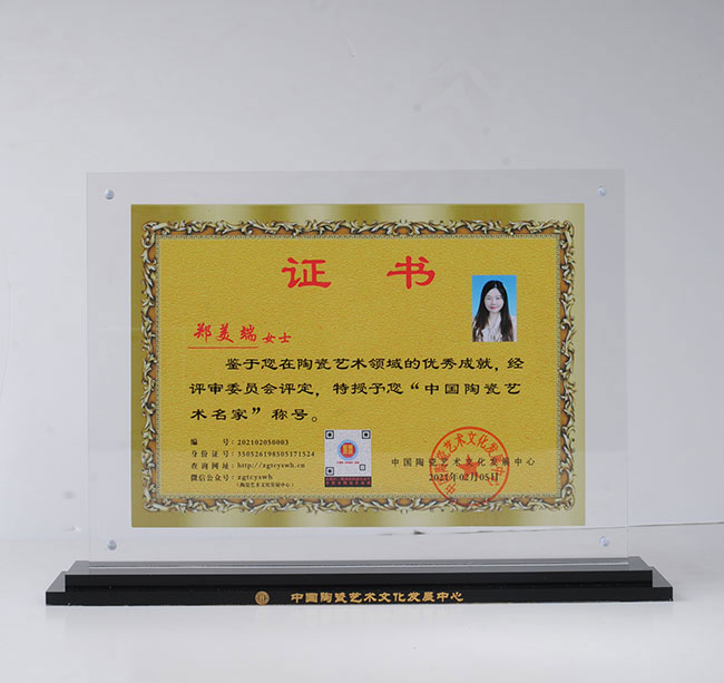 鄭美端,女,漢族,1985年5月出生,大專學(xué)歷,中國陶瓷藝術(shù)名家、中國陶瓷藝術(shù)文化發(fā)展中心會員、福建省德化博雅陶瓷有限公司擔(dān)任藝術(shù)總監(jiān)。