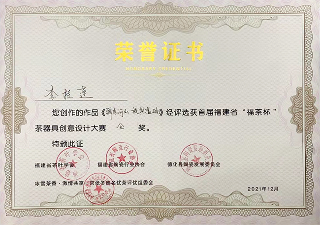 作品《錦秀河山 旋轉(zhuǎn)蓋碗》榮獲2021年福茶杯茶器創(chuàng)意設(shè)計(jì)大賽金獎(jiǎng)。
