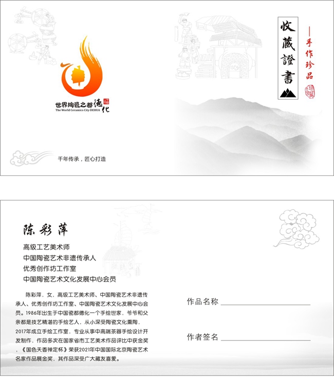 陳彩萍,女,高級(jí)工藝美術(shù)師、中國(guó)陶瓷藝術(shù)非遺傳承人、優(yōu)秀創(chuàng)作坊工作室、中國(guó)陶瓷藝術(shù)文化發(fā)展中心會(huì)員。1986年出生于中國(guó)瓷都德化一個(gè)手繪世家, 爺爺和父親都是技藝精湛的手繪藝人,從小深受陶瓷文化熏陶,2017年成立手繪工作室,專業(yè)從事中高端茶器手繪設(shè)計(jì)開發(fā)制作,作品多次在國(guó)家省市工藝美術(shù)作品評(píng)比中獲金獎(jiǎng)《國(guó)色天香禪定杯》榮獲2021年中國(guó)國(guó)際北京陶瓷藝術(shù)名家作品展金獎(jiǎng),其作品深受廣大藏友喜愛。