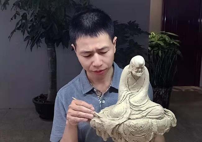 《長(zhǎng)眉羅漢》是鄭金土的代表作品之一,其特征是生下來(lái)就有兩條長(zhǎng)長(zhǎng)的白眉毛。原來(lái)他前世也是一位和尚。因?yàn)樾扌械嚼希济济撀淞,脫剃兩條長(zhǎng)眉毛,仍然修不成正果,死后再轉(zhuǎn)世為人。他出世后,有人對(duì)他的父親說(shuō)道:“佛祖釋迦牟尼也有兩條長(zhǎng)眉,你的兒子長(zhǎng)眉,是佛相。”因此他父親就送他入寺門出家,終修成正果。此件作品慈眉善目,笑容可掬盤坐在馨石之上,左手?jǐn)?shù)著佛珠,仰著頭,詼諧可愛地憨笑著,似乎在津津樂(lè)道地品嘗著人生快樂(lè)。一副兵來(lái)將擋,水來(lái)土掩,泰然處世,處變不驚,動(dòng)中有靜,靜中有動(dòng),穩(wěn)若泰山之態(tài)。人物面部表情刻畫,臉部肌肉緊而不疆,張而不馳,松而不垂,寫實(shí)中略帶夸張,衣紋比例疏密有致,空間大小,富有變化,借鑒中國(guó)畫神韻和內(nèi)涵,行云流水。獨(dú)具一格的藝術(shù)神韻,給人以美的感受。既繼承傳統(tǒng),又不拘泥于傳統(tǒng),創(chuàng)作新穎獨(dú)特,把傳統(tǒng)的技藝與現(xiàn)代手法融為一體。