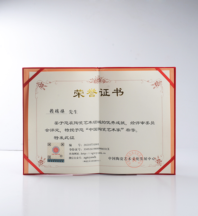德化縣地處福建省中部,與江西景德鎮(zhèn)、湖南醴陵并稱中國三大近代瓷都,是中國陶瓷文化的發(fā)祥地之一。德化窯是中國古代南方著名瓷窯,因窯址位于福建省德化縣而得名。德化瓷的制作始于新石器時代,興于唐宋,盛于明清,技藝獨(dú)特,至今傳承未斷。賴瑞煥正是從小深受千年瓷都德化陶瓷文化熏陶,便酷愛陶瓷藝術(shù),畢業(yè)后開始接觸學(xué)習(xí)陶瓷設(shè)計創(chuàng)作,2012年成立德化明公陶瓷工作室專業(yè)從事陶瓷創(chuàng)作、設(shè)計、生產(chǎn)、生銷,經(jīng)過多年的積累其創(chuàng)作出近百款作品,作品深受廣大客商喜愛。多件作品榮獲各評比金獎,作品《禪定杯》獲榮2021年中國陶瓷藝術(shù)作品評比金獎,2021年榮獲“中國陶瓷藝術(shù)家”,其工作室被評選為“優(yōu)秀創(chuàng)作坊”工作室。