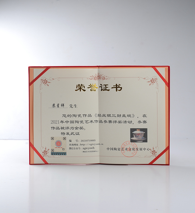 2021年作品《四季如花》、《掐絲銀三才蓋碗》獲榮2021年北京中國陶瓷藝術(shù)名家作品展金獎。