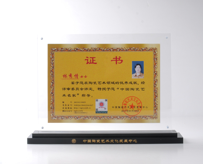 林秀情從小深受千年瓷都德化陶瓷文化熏陶,耳濡目染,便對(duì)德化陶瓷產(chǎn)生濃厚興趣,也喜歡上了陶瓷及其燒制技藝。畢業(yè)后便開(kāi)始從事陶瓷創(chuàng)作,2005年起開(kāi)始專注茶器設(shè)計(jì)生產(chǎn),2013年成立福建德化興永達(dá)陶瓷有限公司并任兼藝術(shù)總監(jiān),經(jīng)過(guò)10多年學(xué)習(xí)與工作積累,熟練掌握泥料選配、器型設(shè)計(jì)、手拉坯、手繪制作、燒制技藝等。其積極探索與大膽創(chuàng)新,將青瓷釉與德化白瓷結(jié)合,并將明清古典風(fēng)與當(dāng)代審美相結(jié)合,產(chǎn)生不一樣的視覺(jué)效果。經(jīng)過(guò)多年創(chuàng)作,其創(chuàng)作出一系列青瓷茶器、茶葉罐等,作品器形豐富,款式新穎,深受廣大客戶喜愛(ài),多件作品被評(píng)為金獎(jiǎng),作品《富貴蓋碗迎客松》、《美人罐鳶尾花》榮獲北京中國(guó)陶瓷藝術(shù)名家作品展金獎(jiǎng)等。