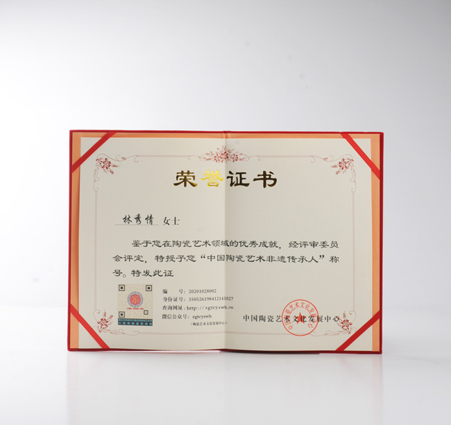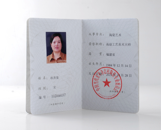 林秀情,1984年出生于世界陶瓷之都德化,中國(guó)陶瓷藝術(shù)名家、中國(guó)陶瓷藝術(shù)非遺傳承人、高級(jí)工藝美術(shù)大師、優(yōu)秀創(chuàng)作坊工作室、中國(guó)陶瓷藝術(shù)文化發(fā)展中心會(huì)員、“興永達(dá)”藝術(shù)總監(jiān)。