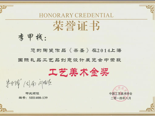這尊作品在2014年上海國際禮品工藝品創(chuàng)意設(shè)計展覽會中榮獲“工藝美術(shù)金獎”。