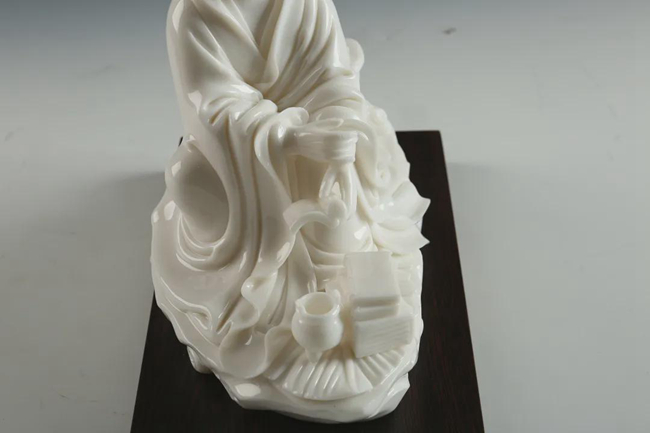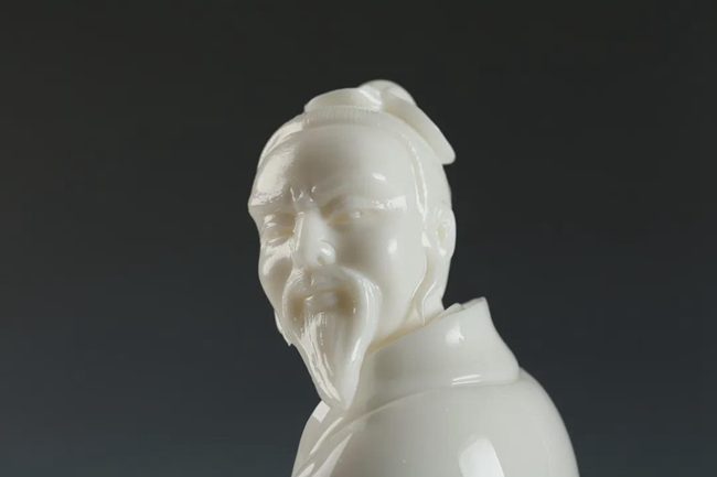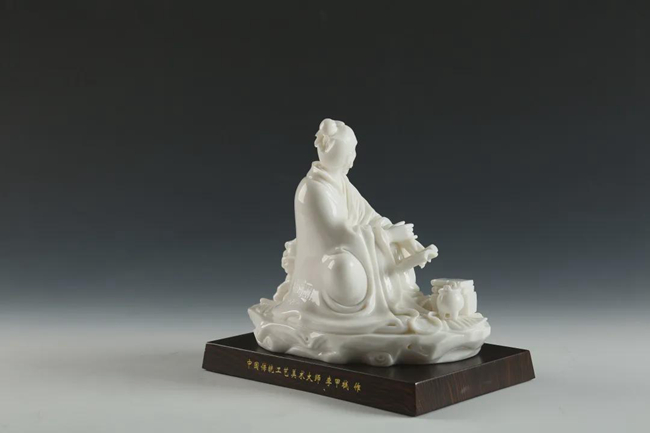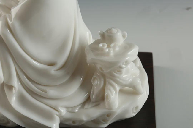 李甲棧大師的這尊作品選用德化窯優(yōu)質(zhì)白瓷泥,燒成后瓷體柔光,脂感較強(qiáng),較好地保留了純手工制作的精細(xì)感。作品博采眾長、自成一格,極具個人藝術(shù)特色,又富有創(chuàng)新韻味。