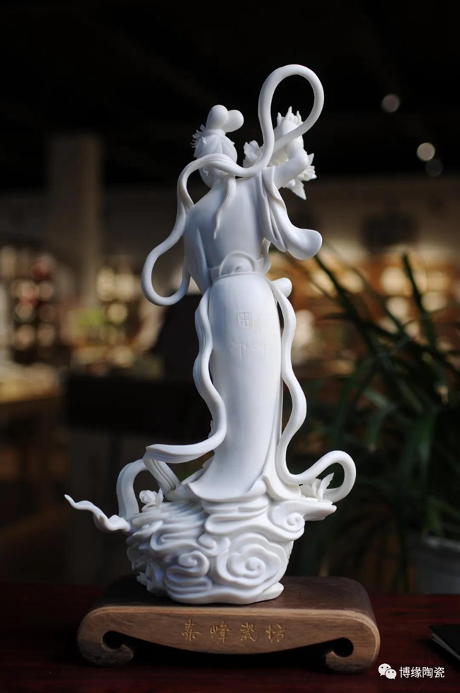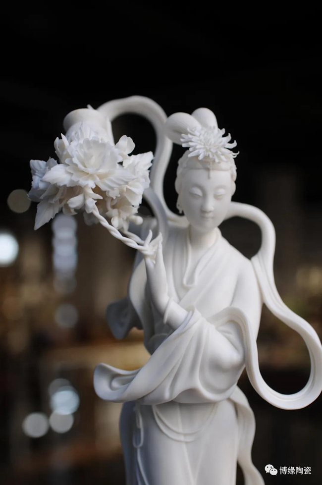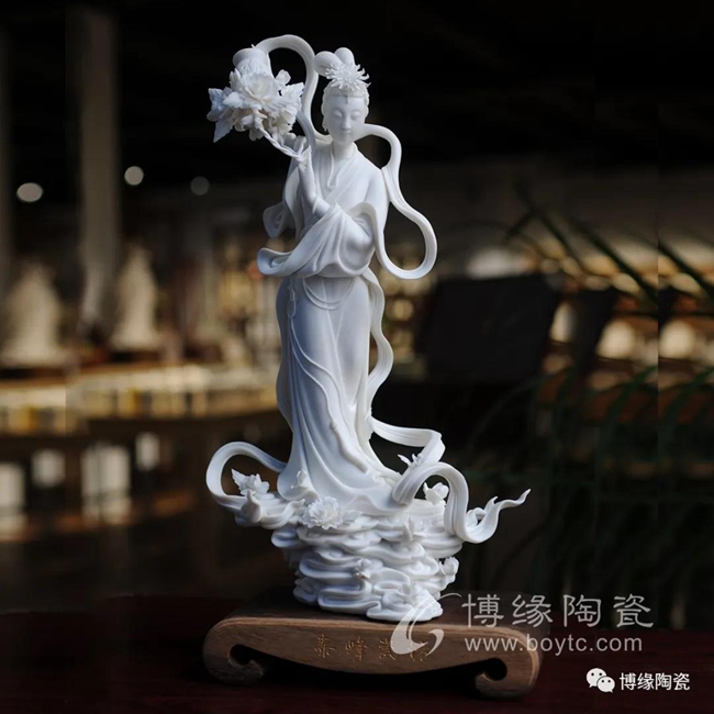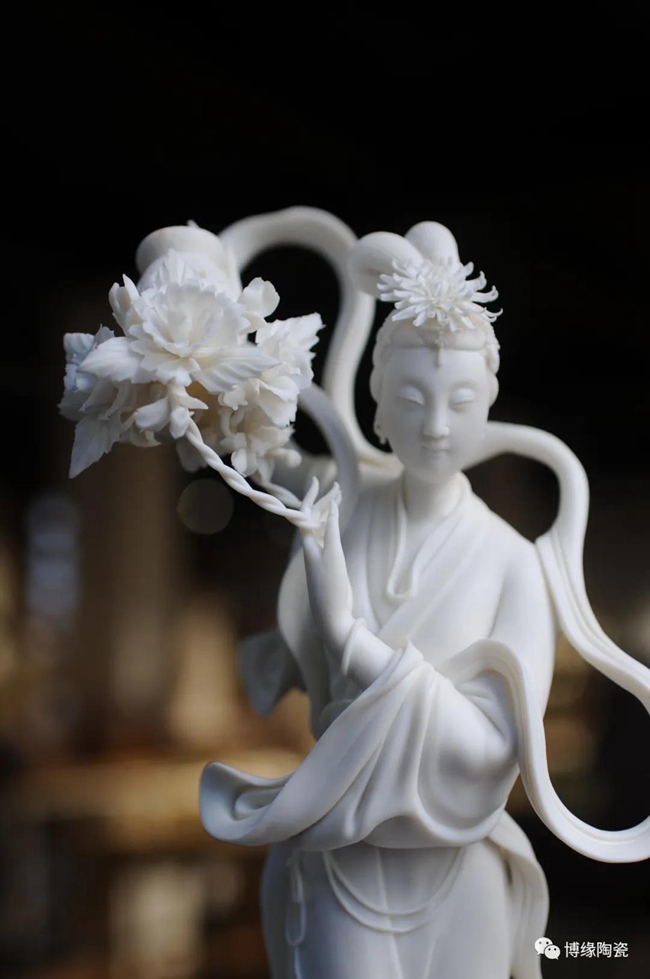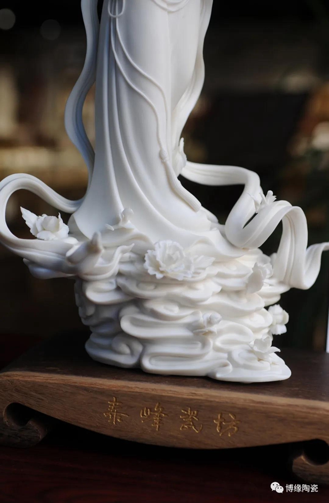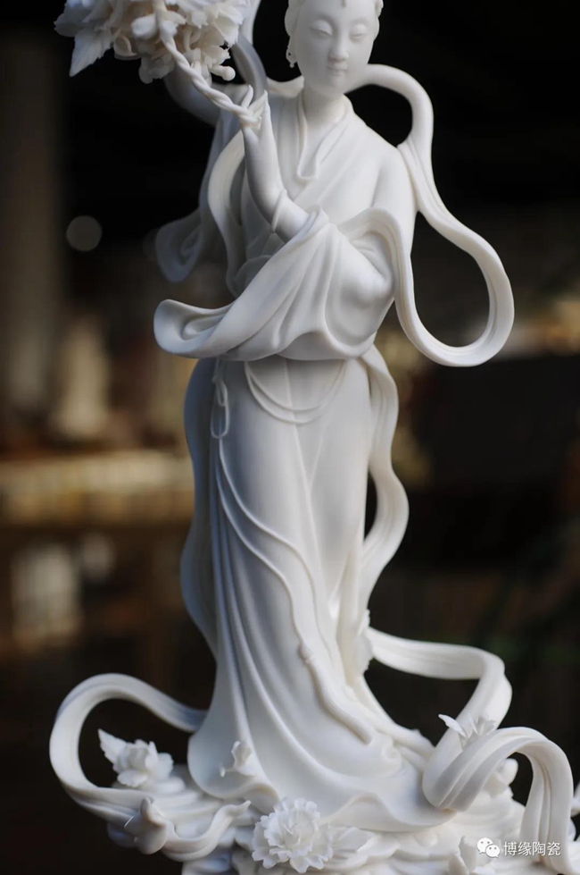 德化是“中國(guó)白的故鄉(xiāng)”,在世界瓷壇獨(dú)樹(shù)一幟,被稱為“世界白瓷之母”,德化白瓷溫潤(rùn)、明凈、典雅、精巧,被稱“象牙白”、“鵝絨白”,素有“世界白瓷看中國(guó),中國(guó)白瓷看德化”之稱。早在明代德化白瓷就名聲在外,一代“瓷圣”何朝宗名作流傳后世,成為世界各大博物館收藏的珍品,更對(duì)雕塑史上產(chǎn)生深遠(yuǎn)的影響,形成“何派”雕塑,其開(kāi)創(chuàng)的捏、塑、雕、刻、刮、削、接、貼八字技法延用至今。何派雕塑注重于細(xì)節(jié)之美,精益求精,故而十分著意衣紋的刻畫(huà),使線條流暢,翻轉(zhuǎn)自然。觀其作品仿佛有春風(fēng)拂面,衣袂飄揚(yáng)的出塵之感。