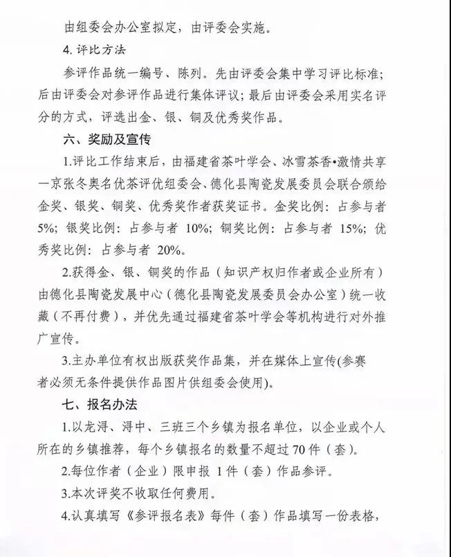 2.獲得金、銀、銅獎的作品(知識產(chǎn)權(quán)歸作者或企業(yè)所有)由德化縣陶瓷發(fā)展中心(德化縣陶瓷發(fā)展委員會辦公室)統(tǒng)一收藏(不再付費),并優(yōu)先通過福建省茶葉學(xué)會等機構(gòu)進行對外推廣宣傳。