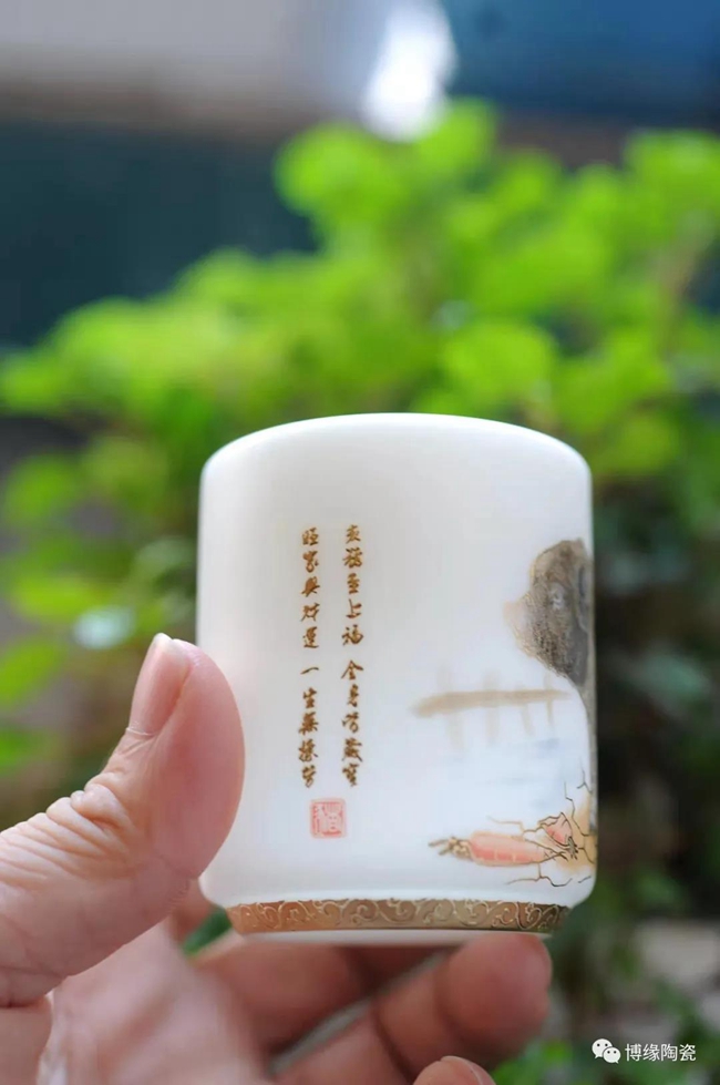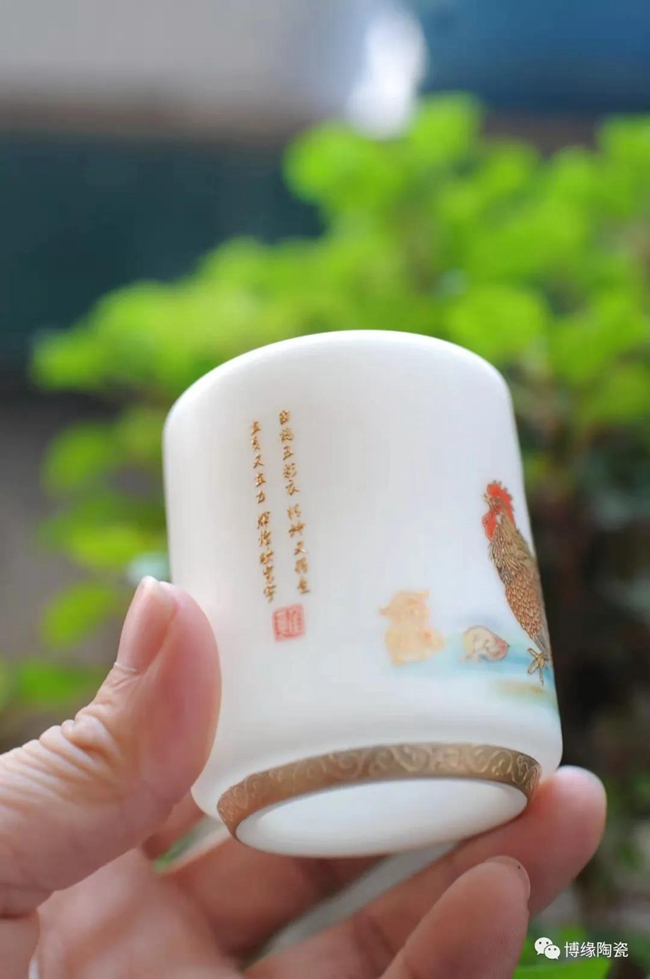 杯底圈足描金,手繪圖案精美,半立體紋路,觸感豐富,杯體白而透光,質(zhì)感溫潤潔白, 襯托茶色之佳品。