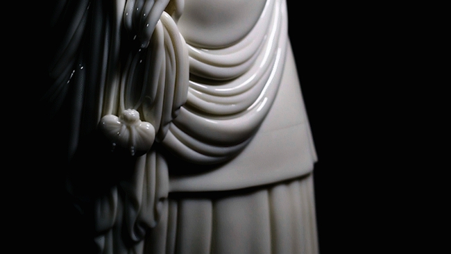 我們驚喜地發(fā)現(xiàn),在這件作品中,璋高把傳統(tǒng)德化瓷雕中對人物衣襟細(xì)節(jié)處理的方法,即“曹衣出水”般絲質(zhì)的感觀與何派“褒衣博帶”圓潤含蓄的中原文化風(fēng)格的結(jié)合,在這件作品的下半部分的裙裾處表現(xiàn)得酣暢淋漓。