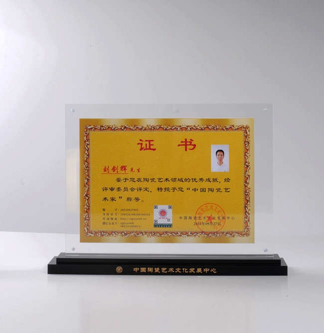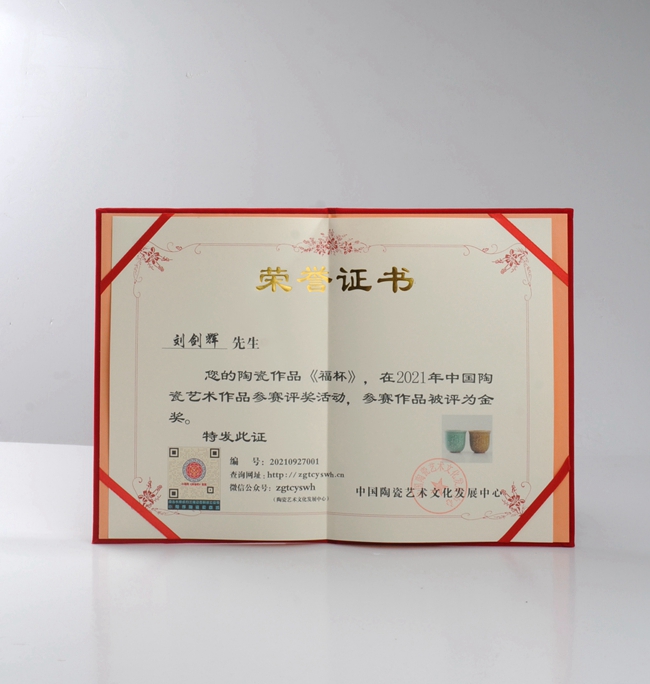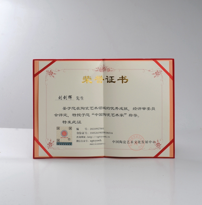 德化上千年的陶瓷文化,給予了德化白瓷以豐厚的滋養(yǎng),劉劍輝從小出生于瓷都德化,便耳濡目染,自小對德化陶瓷產(chǎn)生深厚興趣,2009年開始從事陶瓷生產(chǎn)制作,熟練掌握陶瓷雕塑設(shè)計(jì)、上釉、手拉胚、燒制等技藝,經(jīng)過10多年積累,2017年劉劍輝成立德化縣彩輝陶瓷研究所,專業(yè)從事陶瓷茶具、主人杯、傳統(tǒng)雕塑生產(chǎn)制作,創(chuàng)作出一系列優(yōu)秀作品,其作品深受廣大收藏愛好者喜愛,多件作品榮獲各評比金獎(jiǎng),作品《福杯》榮獲2021中國陶瓷藝術(shù)名家作品評比金獎(jiǎng)等,被評為“高級工藝美術(shù)大師”,2021年被中國陶瓷藝術(shù)文化發(fā)展中心評選為“中國陶瓷藝術(shù)家”等。
