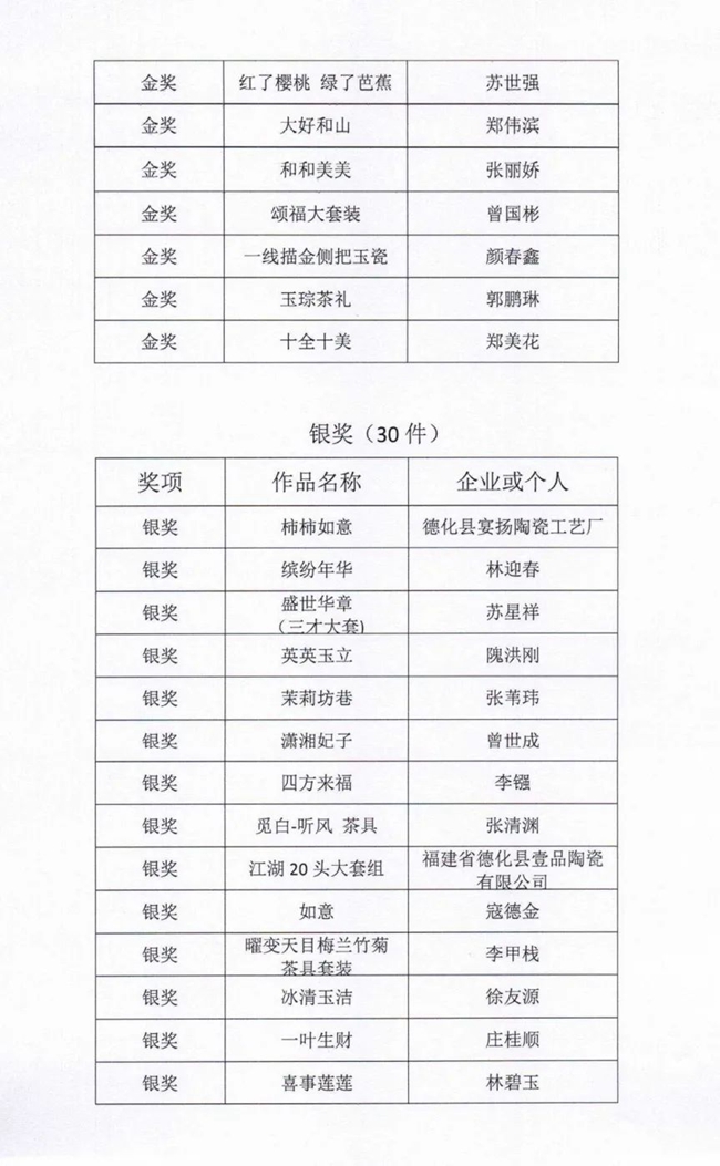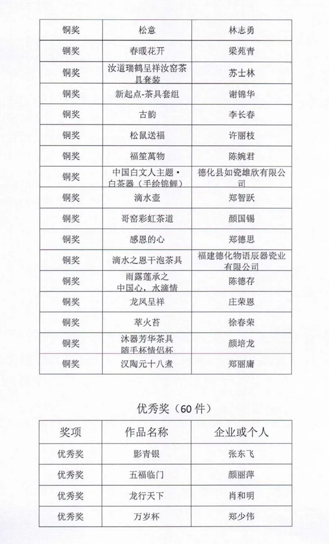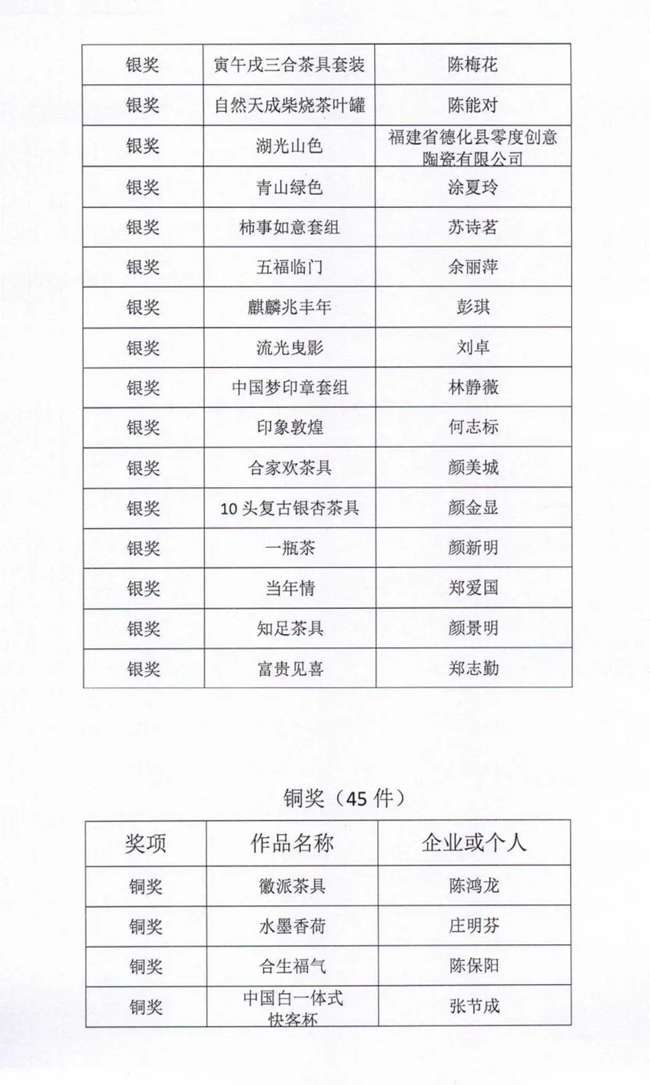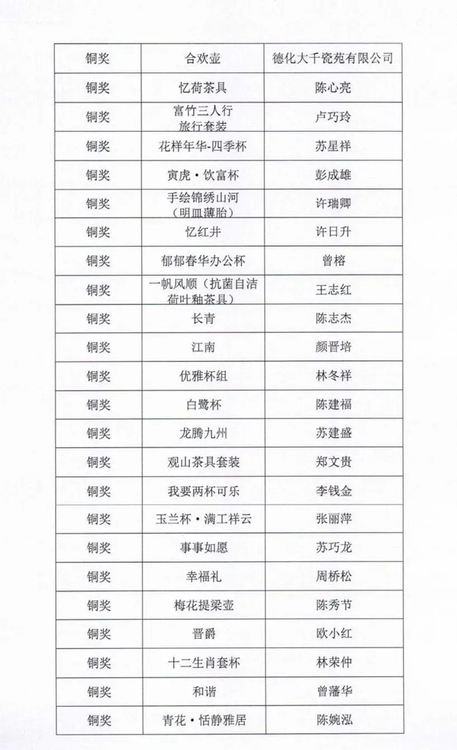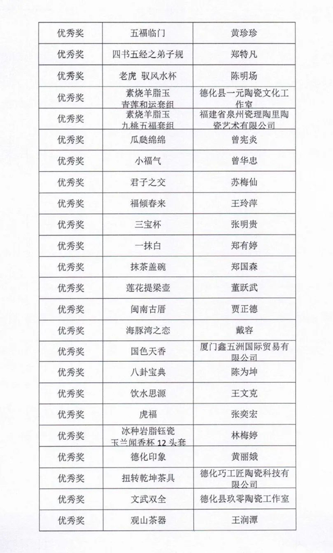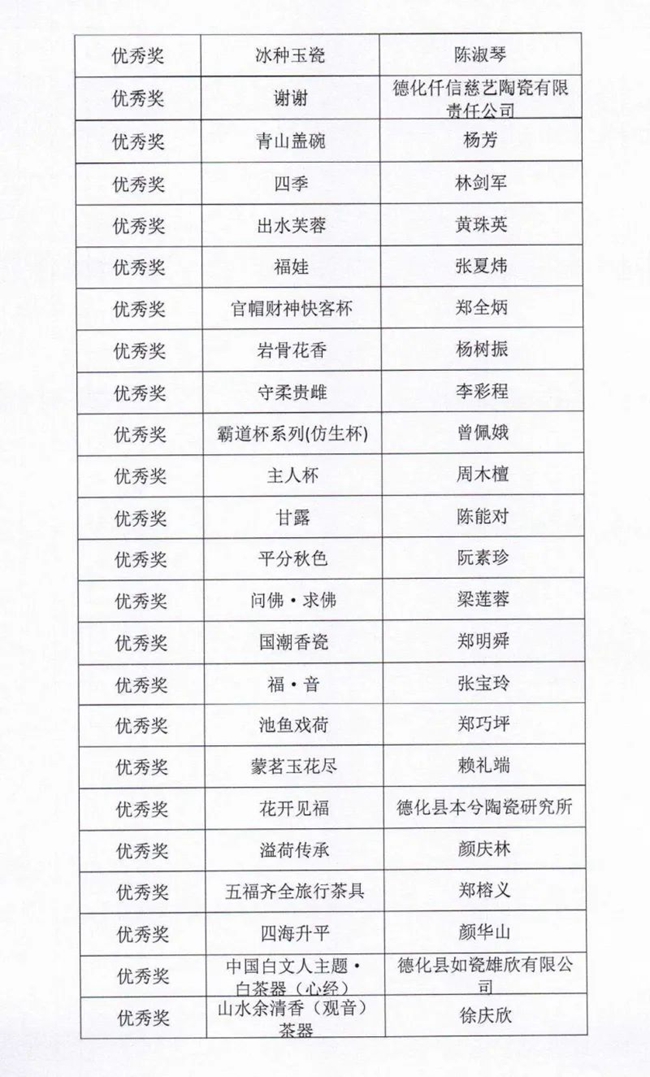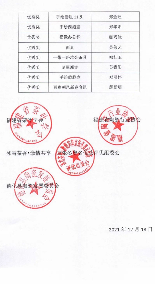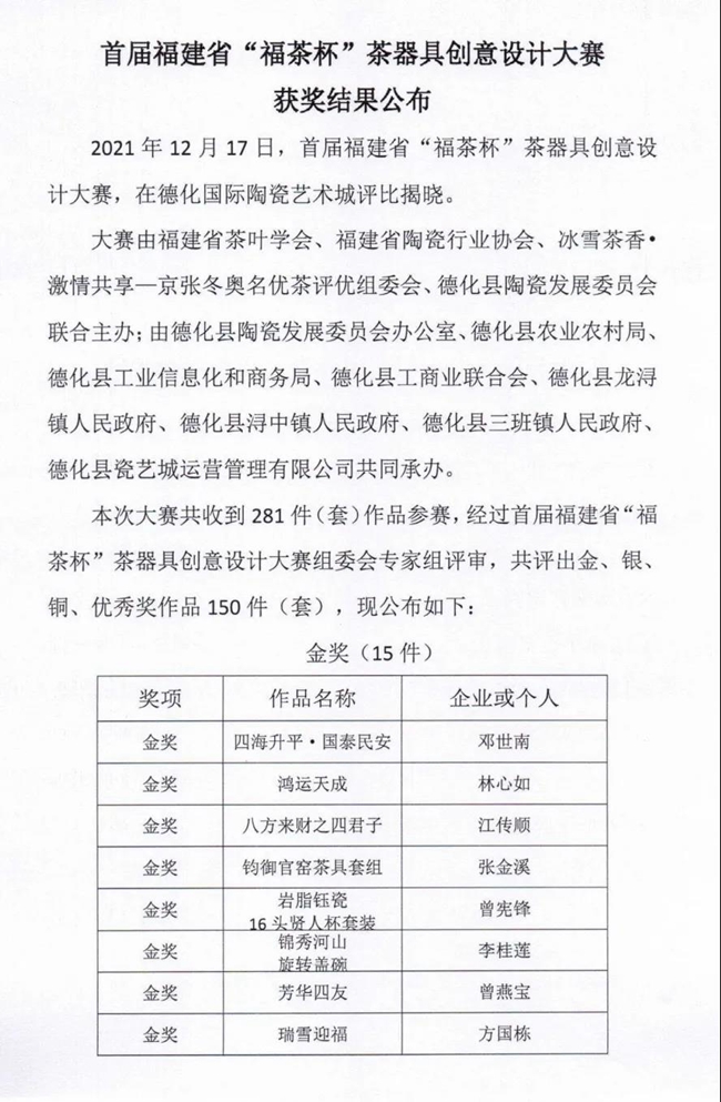 2021年12月18日,首屆福建省“福茶杯”茶器具創(chuàng)意設(shè)計大賽頒獎儀式,在德化國際陶瓷藝術(shù)城舉辦。福建省政協(xié)原副主席李祖可,福建省茶葉學(xué)會名譽會長、福建省人大農(nóng)經(jīng)委原副主任馮廷佺,東南亞收藏家聯(lián)誼會會長陳鷹,福建省茶葉學(xué)會副會長、福建省農(nóng)業(yè)廳原副廳長鄒榮貴,福建省陶瓷行業(yè)協(xié)會秘書長葉少芬,福建省茶葉學(xué)會常務(wù)副秘書長、《福建茶葉》副主編唐輝,德化縣人民政府代縣長方俊欽,德化相關(guān)鄉(xiāng)鎮(zhèn)、縣直有關(guān)單位主要領(lǐng)導(dǎo)及獲獎代表共同出席頒獎典禮。