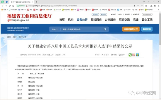 2022年4月18日,從福建省工業(yè)和信息化廳網(wǎng)站了解到,福建省第八屆中國工藝美術(shù)大師推薦人選公示,全省共13人入選,分別為:馮 偉、劉傳斌、許瑞峰、何 馬 、張木芳、吳文忠、陳明志、張建奎、宋春國、吳德強、鄭則評、林建勝、袁師永。