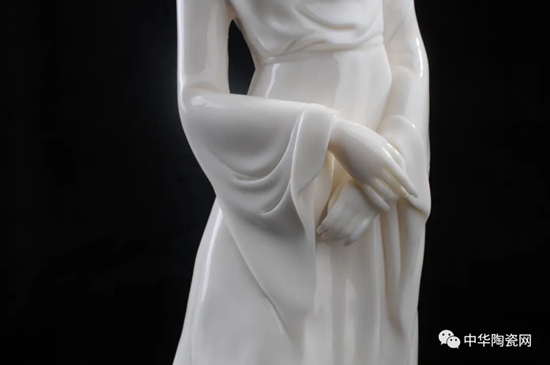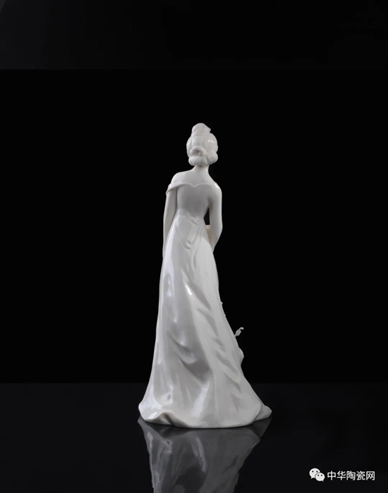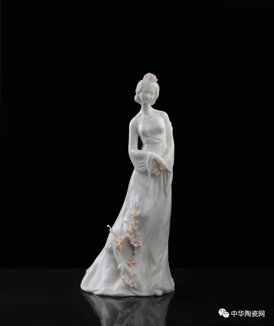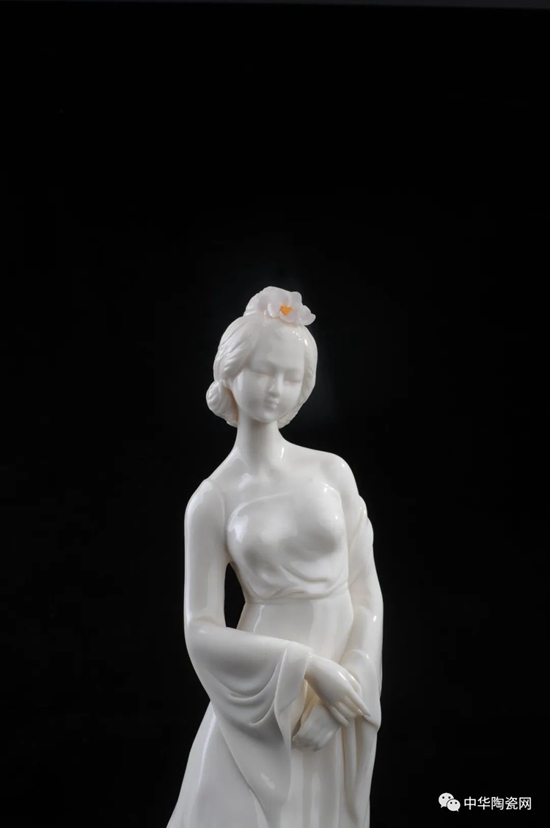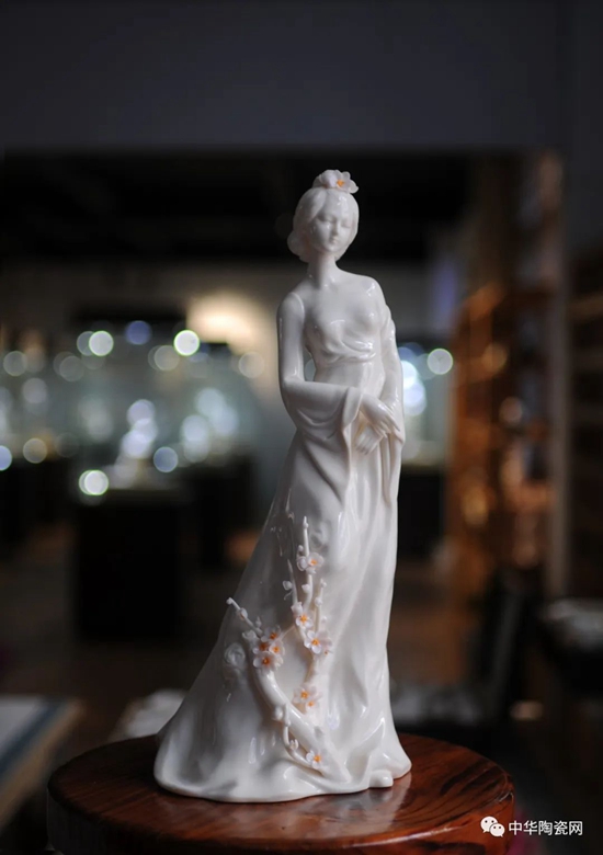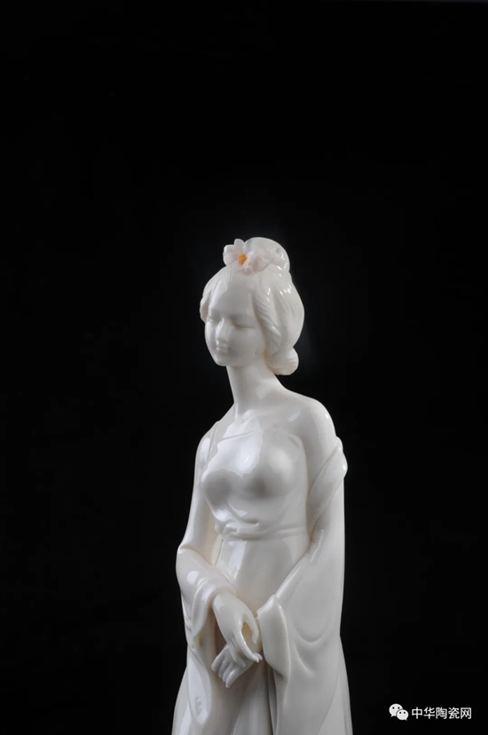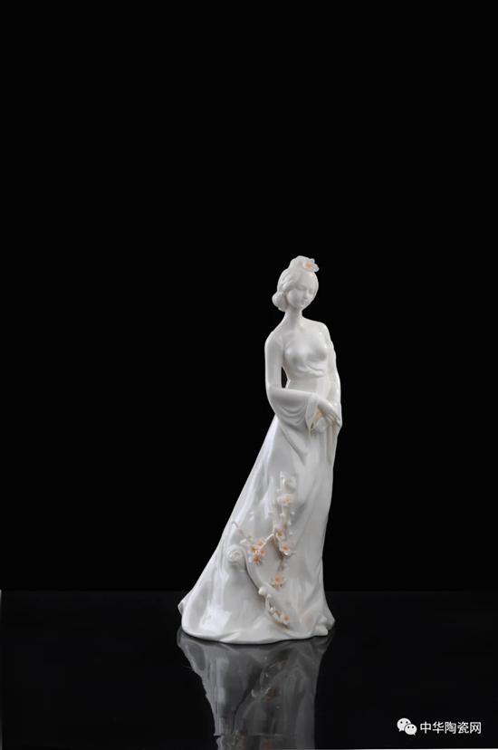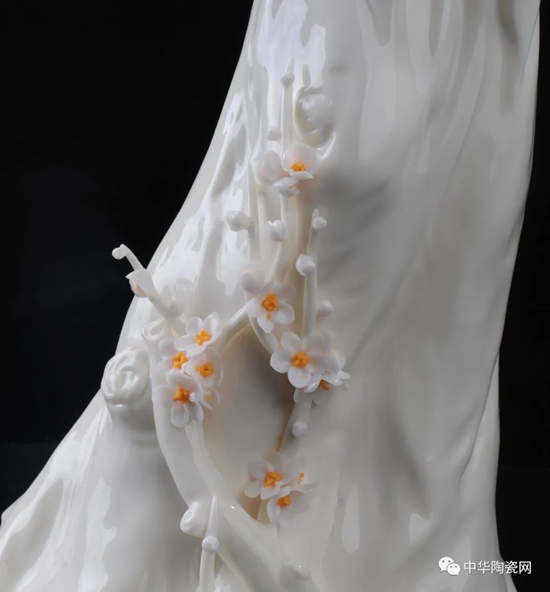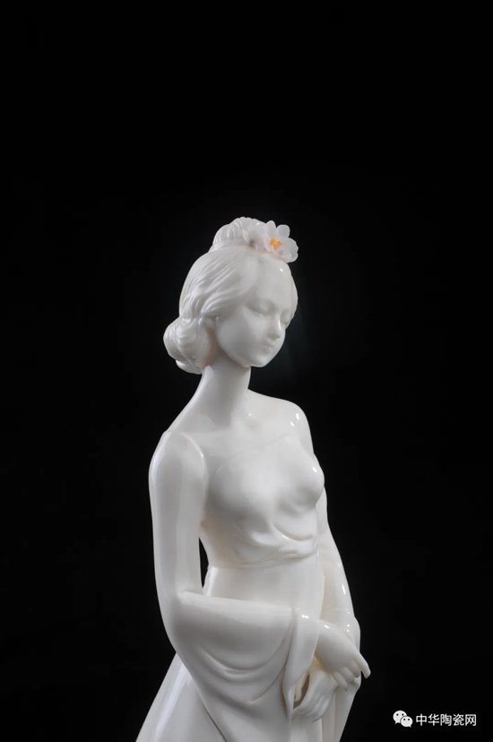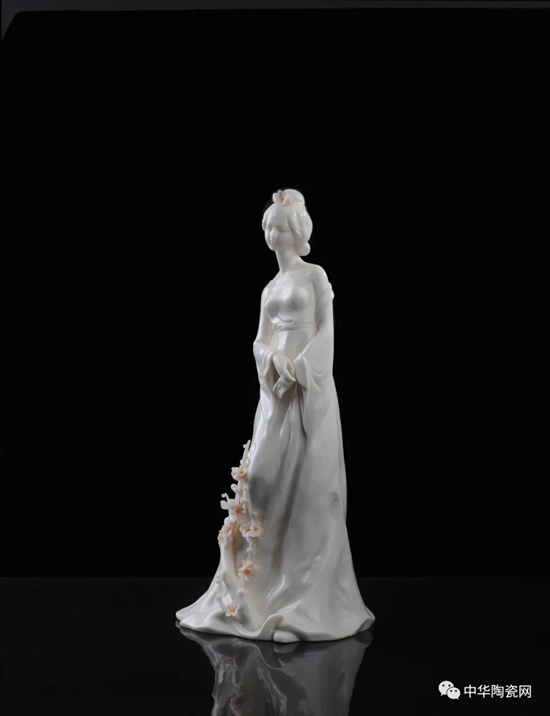《花之夢寒香》由全國技術(shù)能手——邱玉珍設(shè)計創(chuàng)作,作品采用德化白瓷為胎質(zhì),可見一女子身著長裙,身體向一側(cè)稍曲,人物線條柔美,委婉動人,采用手工瓷花捏花堆雕作為裝飾,使之更顯精細(xì)。