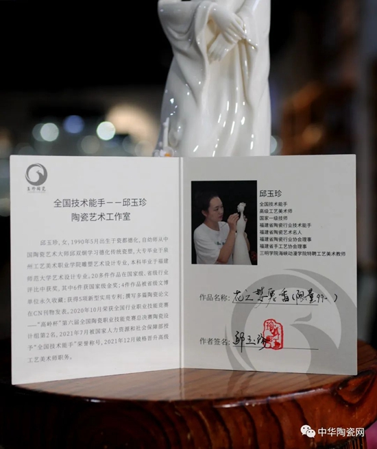 邱玉珍,女,全國技術(shù)能手、高級工藝美術(shù)師、國家一級技師 、福建省陶瓷行業(yè)技術(shù)能手、福建省陶瓷藝術(shù)名人、福建省陶瓷行業(yè)協(xié)會理事、福建省手工協(xié)會理事、三明學(xué)院海峽動漫學(xué)院特聘工藝美術(shù)教師。2016年畢業(yè)于福建師范學(xué)院,畢業(yè)后師從邱雙炯大師學(xué)習(xí)傳統(tǒng)雕塑。2020年中國技能大賽——“高嶺杯”第六屆全國陶瓷職業(yè)技能競賽總決賽榮獲第二名;2020榮獲福建省陶瓷行業(yè)職工技能大賽暨2020年中國技能大賽第二名;2019年《長相思》榮獲第七屆中國陶瓷名家作品展暨2019年陶瓷作品榮獲金獎,2018年作品《霓裳羽衣歌》榮獲第十二屆合肥國際文化博覽會優(yōu)秀作品評比金獎等。