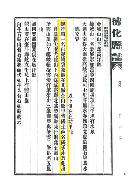 德化地處“閩中屋脊”戴云山脈腹地,高嶺土質(zhì)優(yōu)量多。據(jù)民國《德化縣志》記載:“觀音崎,一名白泥崎,碧像巖在其巔,全山數(shù)里皆瓷土,邑名瓷多產(chǎn)于此。”