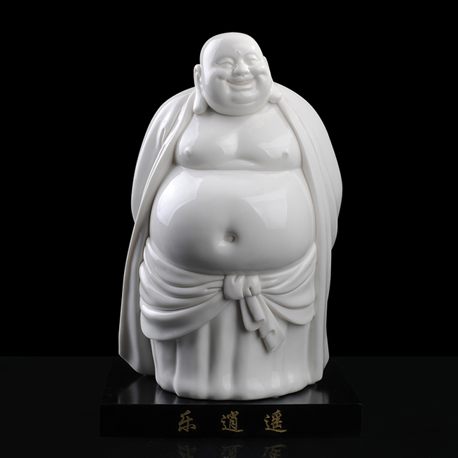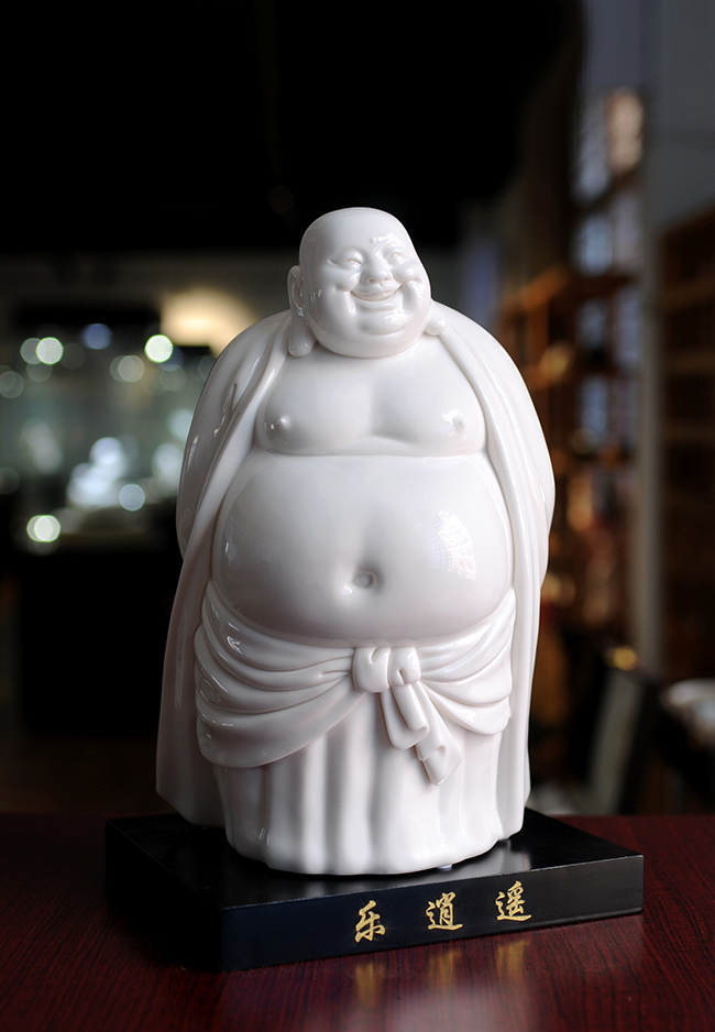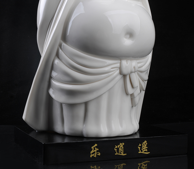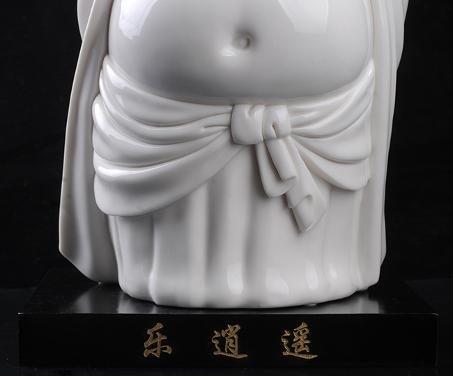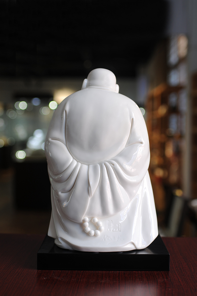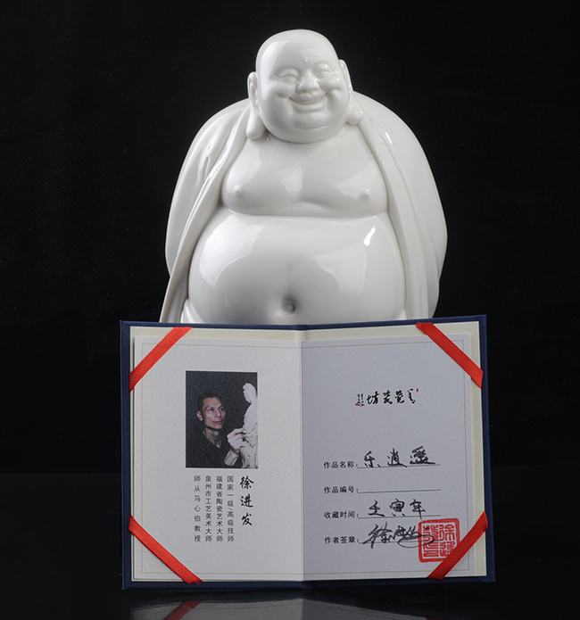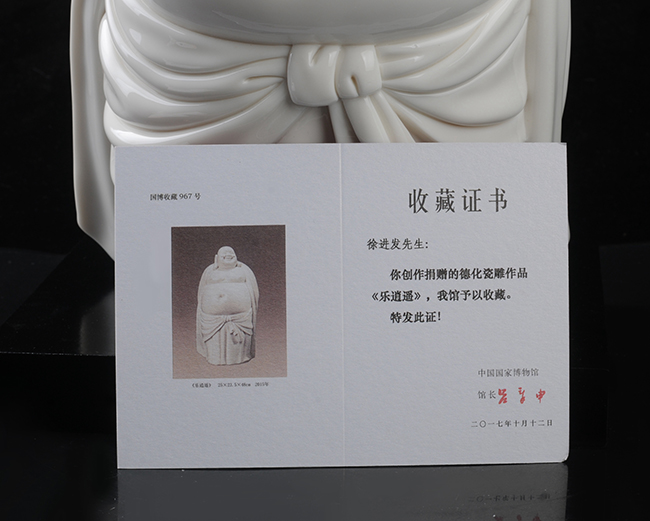 《樂逍遙》由福建省陶瓷藝術(shù)大師——徐進發(fā)制作,作品長20.5cm,寬17cm, 高31cm,采用德化優(yōu)質(zhì)高嶺土,經(jīng)1300多度高溫燒制,作品胎體溫潤,線條簡潔柔美,精雕細刻,彌勒佛造型喜笑顏開,酒窩深陷,大耳垂肩,逍遙自在,形象刻畫生動,栩栩如生,手工雕刻展現(xiàn)精湛雕工。作品被中國國家博物館收藏,背面落有徐進發(fā)大師手簽名及印章款,具有很高的收藏及鑒賞價值。