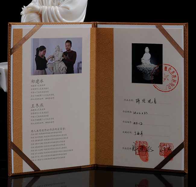 《持經(jīng)觀音》由福建省陶瓷藝術(shù)大師鄭建冰設(shè)計(jì)創(chuàng)作。作品以德化溫潤(rùn)如玉的 “中國(guó)白”為胎質(zhì),經(jīng)1300多度高溫?zé),胎體溫潤(rùn)如玉。作品觀音面容飽滿,神情刻畫,逼真自然,匠心造像,手持經(jīng)書,衣紋線條柔美,流暢自然,形象塑造,生動(dòng)自然,精雕細(xì)刻,栩栩如生。觀音慈悲之相,宛然可見。作品落有大師個(gè)人簽名及印章落款,兼具審美價(jià)值和收藏價(jià)值,是不可多得的雅作。是辦公、家居、書房裝飾擺設(shè)、禮贈(zèng)、收藏的好選擇。