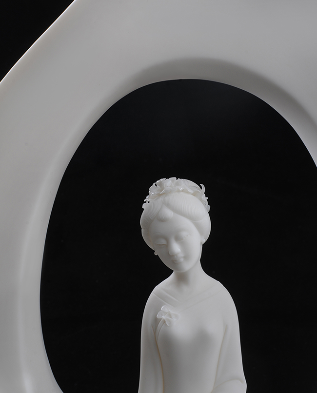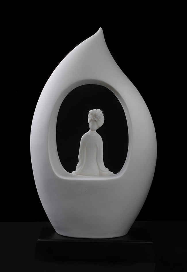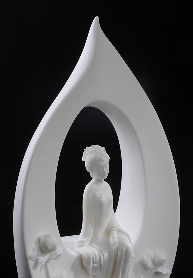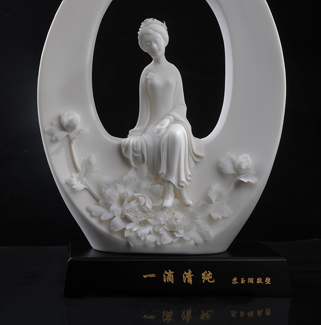 作品《一滴清純》以德化溫潤(rùn)如玉的“中國(guó)白”為胎質(zhì),由福建省工藝美術(shù)大師蘇玉湖手工制作,整體以水滴為造型設(shè)計(jì),少女雙目微閉,頭微微低垂,嘴角帶微笑,半側(cè)身優(yōu)雅而坐,似乎在聆聽(tīng)著什么,所塑女子溫婉賢淑,神態(tài)逼真,刻畫(huà)細(xì)致,作品底部采用手工捏花做為裝飾,牡丹精細(xì),使整件作品更精湛及富有詩(shī)意,水滴為外觀造型,借水之純,間接體現(xiàn)出少女豆蔻年花之美。作品雅氣、清秀, 作品背部落有蘇玉湖手刻簽名,是一件集收藏、家居裝飾的精品。