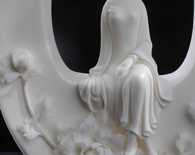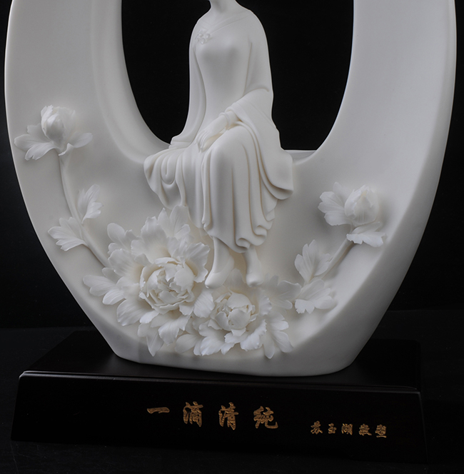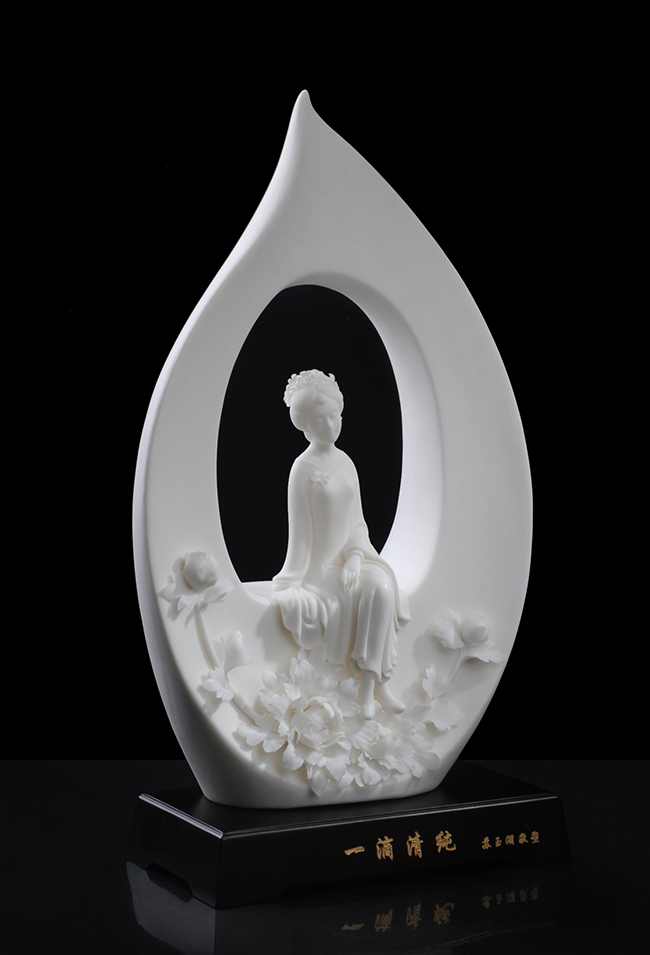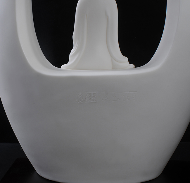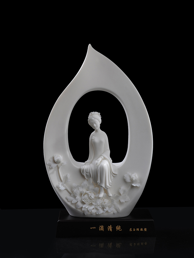 作品《一滴清純》以德化溫潤如玉的“中國白”為胎質(zhì),由福建省工藝美術(shù)大師蘇玉湖手工制作,整體以水滴為造型設(shè)計,少女雙目微閉,頭微微低垂,嘴角帶微笑,半側(cè)身優(yōu)雅而坐,似乎在聆聽著什么,所塑女子溫婉賢淑,神態(tài)逼真,刻畫細(xì)致,作品底部采用手工捏花做為裝飾,牡丹精細(xì),使整件作品更精湛及富有詩意,水滴為外觀造型,借水之純,間接體現(xiàn)出少女豆蔻年花之美。作品雅氣、清秀, 作品背部落有蘇玉湖手刻簽名,是一件集收藏、家居裝飾的精品。