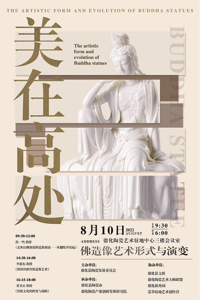 2022年8月10日,由德化縣陶瓷發(fā)展委員會(huì)主辦,陶瓷辦、德化陶瓷產(chǎn)業(yè)創(chuàng)新發(fā)展研究院承辦的名師講堂,將于德化陶瓷藝術(shù)駐地中心舉行。本次活動(dòng)特邀清華大學(xué)美術(shù)學(xué)院董書(shū)兵教授、北京工業(yè)大學(xué)藝術(shù)設(shè)計(jì)學(xué)院李惠東教授、麥積山石窟藝術(shù)研究所研究員段一鳴等佛造像專家學(xué)者從專業(yè)的角度,剖析陶瓷宗教造像雕塑語(yǔ)言,探索魅力無(wú)窮的佛教造像藝術(shù)。
