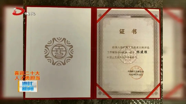 8月18日,第八屆中國工藝美術(shù)大師頒證儀式在南京舉行,我縣新晉中國工藝美術(shù)大師林建勝在這一天拿到了這份沉甸甸的證書。