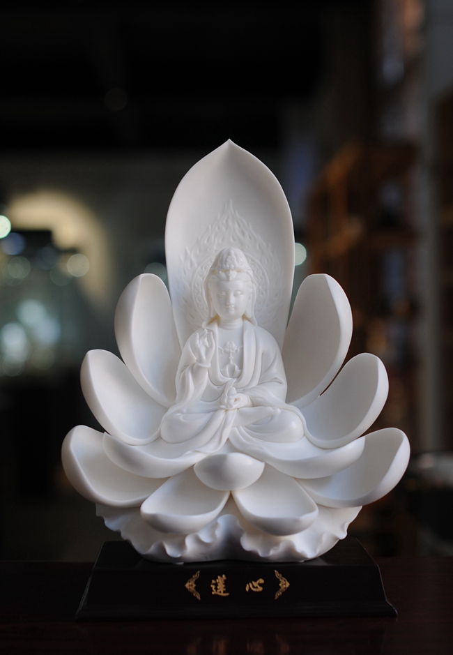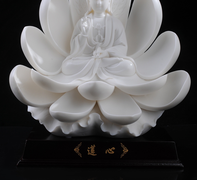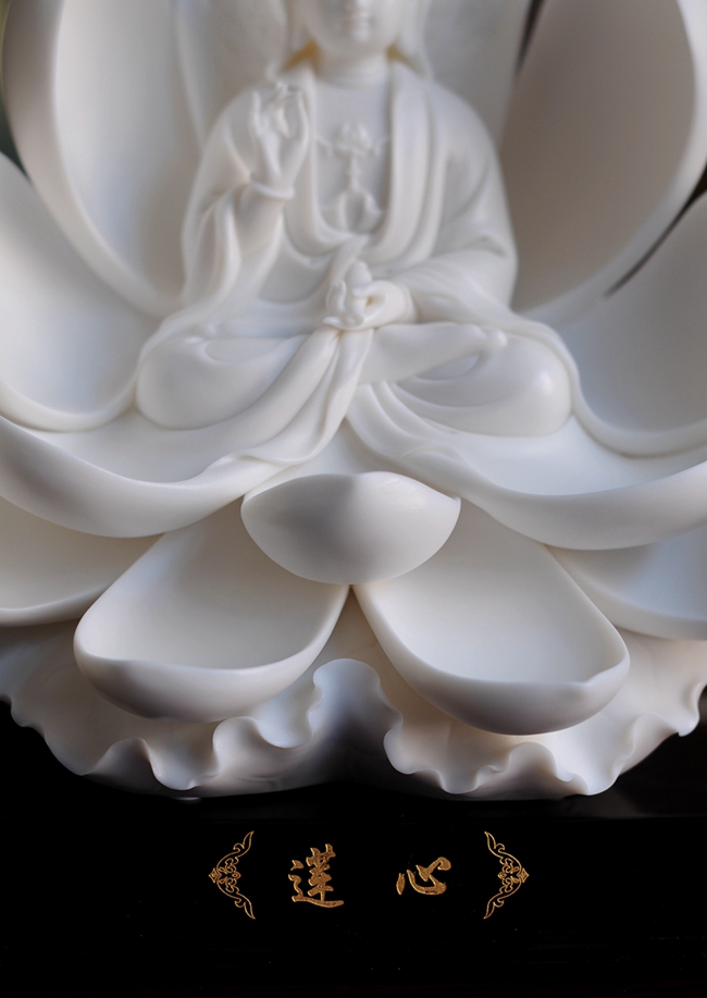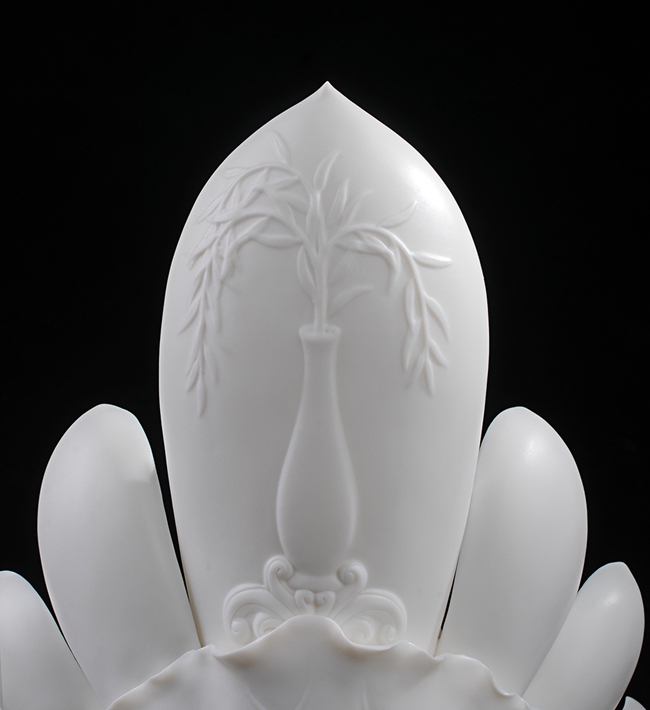 手持玉瓶,盤坐于優(yōu)美綻放的蓮花臺(tái),形象精心塑造