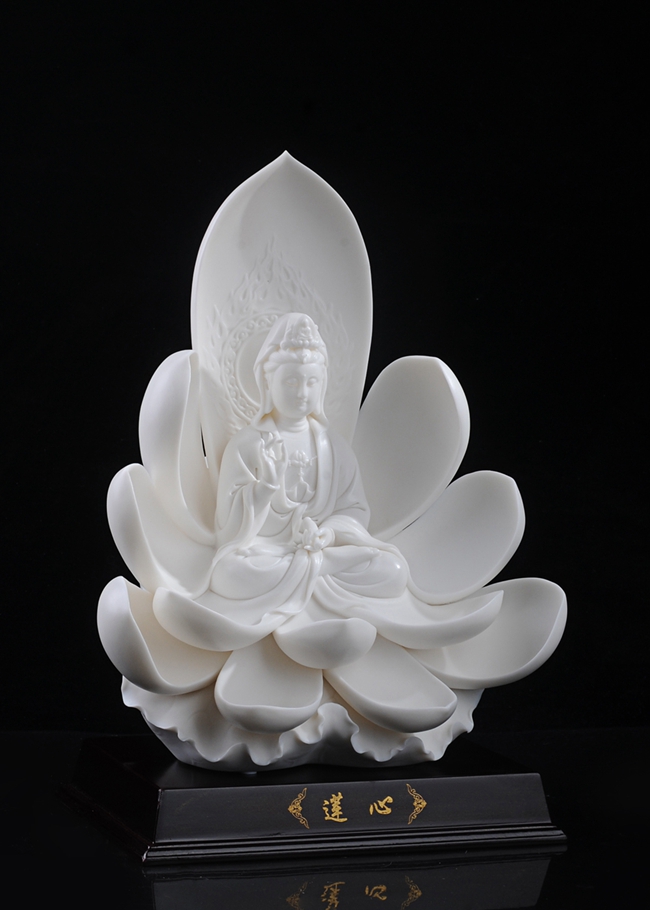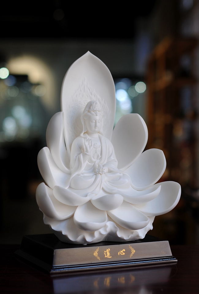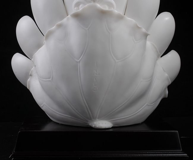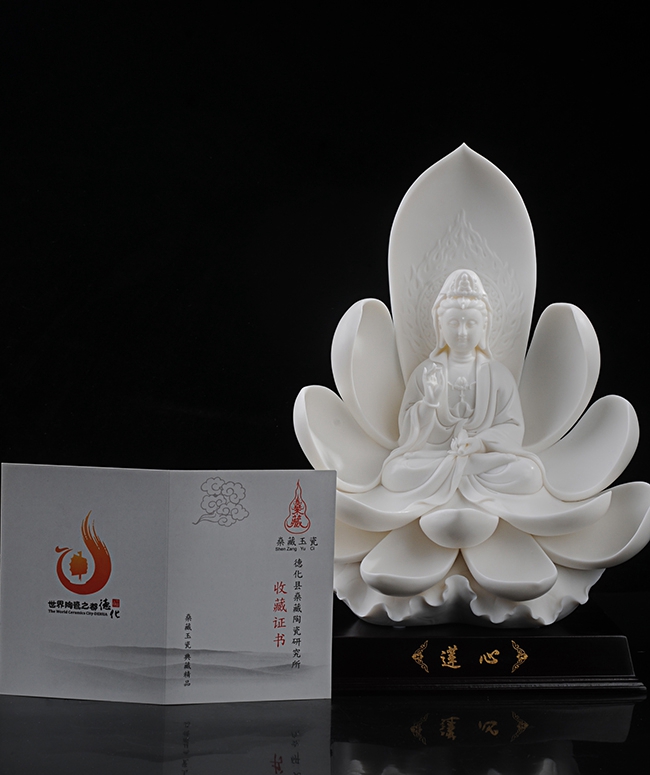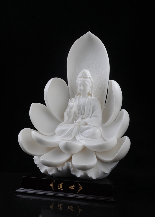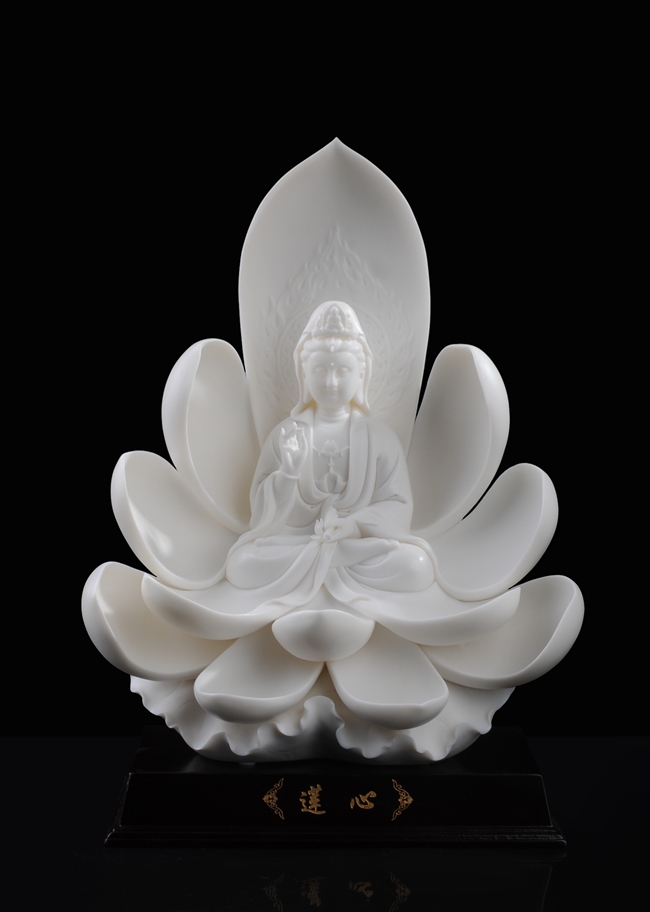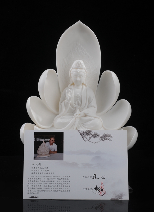 《蓮心》由國家高級(jí)/一級(jí)技師林弋新設(shè)計(jì)創(chuàng)作。作品以德化溫潤如玉的“中國白”為胎質(zhì),經(jīng)1300多度高溫?zé),胎體通透,溫潤如玉,瓷感細(xì)膩。 觀音菩薩神情嫻雅平靜,安詳自若,靜神凝思,手持玉瓶,盤坐于優(yōu)美蓮花之中,蓮花出污泥而不染,代表純凈。觀音端坐蓮花象征著其神圣本源,也代表潔白無瑕、極盡善美。 作品塑造生動(dòng)自然,細(xì)致刻畫。背面落有大師印章落款,是值得收藏和觀賞的佳作,是辦公、家居、書房裝飾擺設(shè)、禮贈(zèng)、收藏的好選擇。