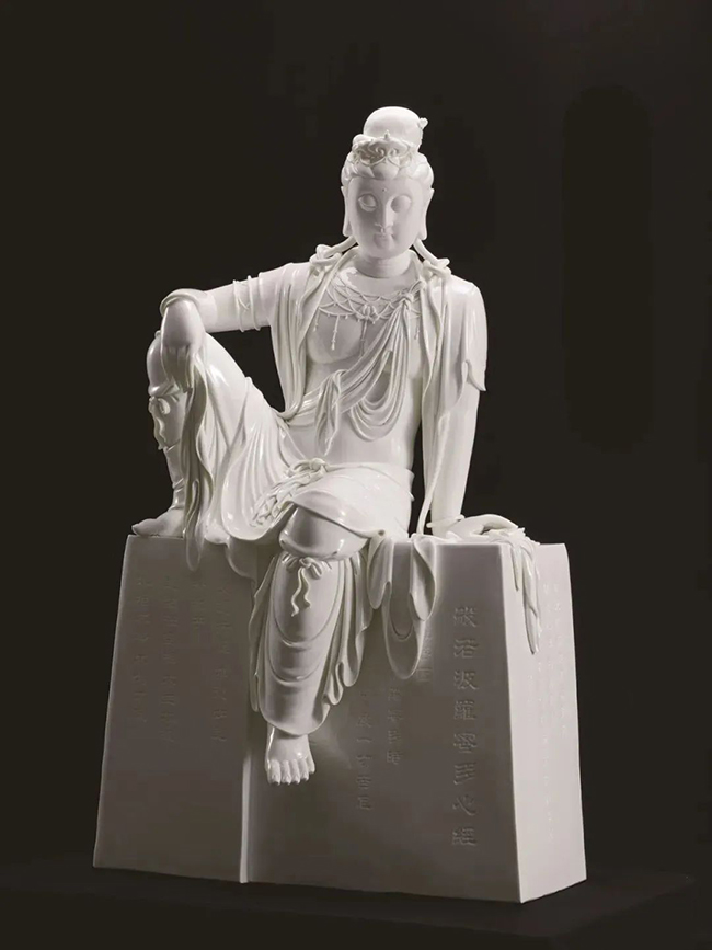 在工藝上,作品也實(shí)現(xiàn)了兩大突破,一是體量大,長(zhǎng)0.75米、寬0.45米、高1.45米,是迄今德化長(zhǎng)度最大的單體瓷塑觀音;二是方塊大,觀音所坐之《心經(jīng)》方塊是一巨大梯形體,填補(bǔ)了德化窯燒制大型方塊的空白。