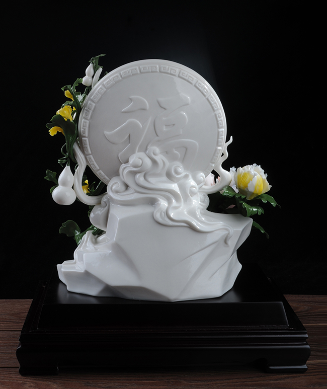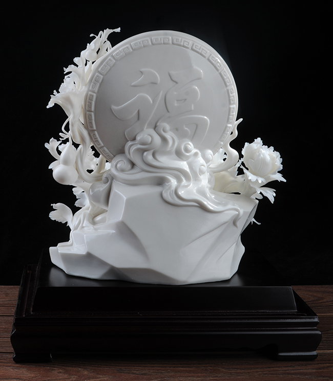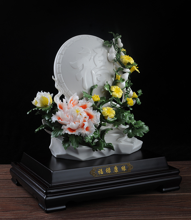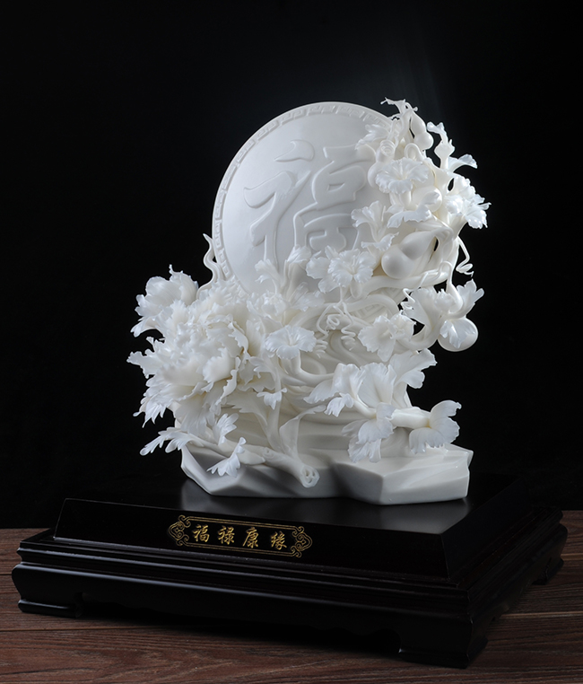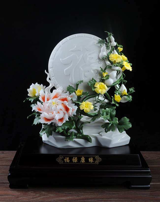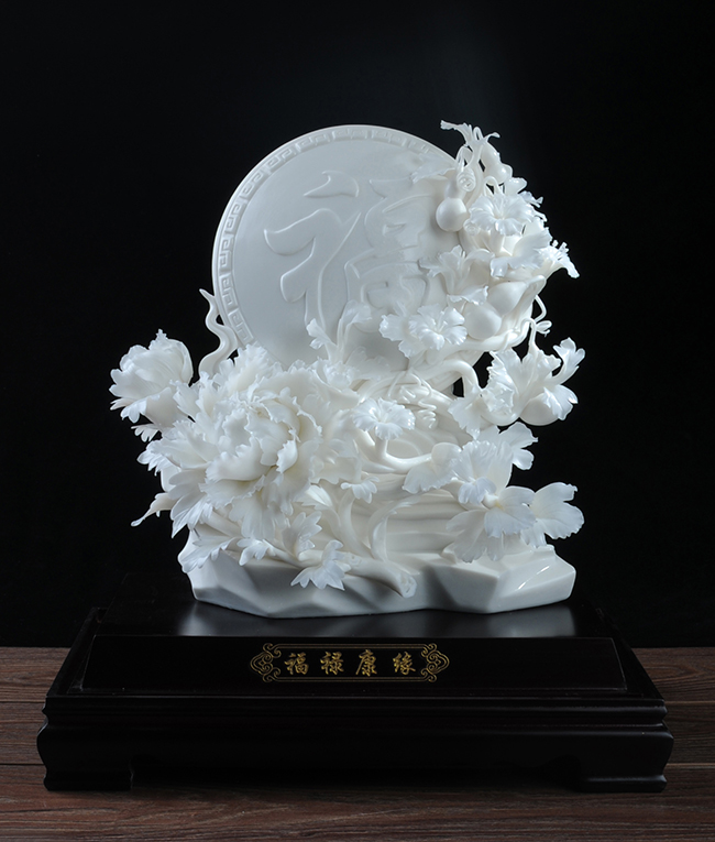 《福祿康緣》作品由工藝美術(shù)大師設(shè)計創(chuàng)作,以具有”中國白" 的德化瓷與傳統(tǒng)如意文化相結(jié)合雕刻而成。作品雕刻精細(xì),巖石上可見有牡丹、葫蘆,福字雕刻點(diǎn)綴。葫蘆諧音福祿,有著財富、富貴的象征,牡丹代表富貴,綠葉枝干線條流暢、簡潔,整件作品構(gòu)思巧妙,布局合理,把福祿康緣這一美好寓意表現(xiàn)得淋漓盡致。作品是店鋪、辦公、家居客廳、書房擺設(shè),禮贈、收藏的好選擇。