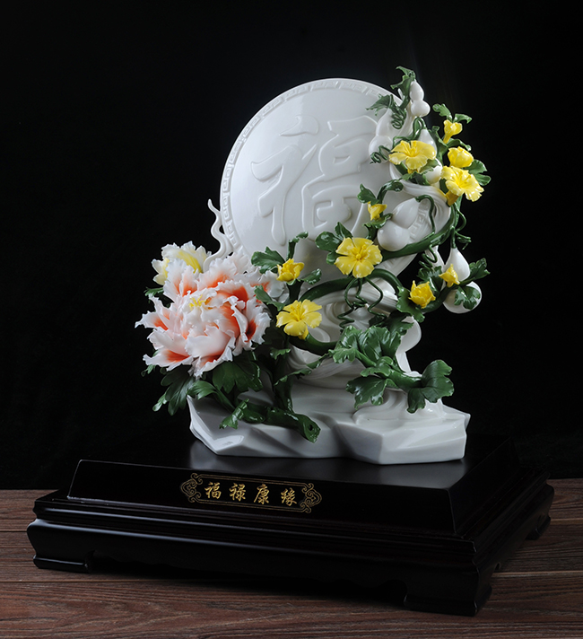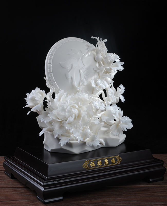 采用高嶺土為制作材料,經(jīng)手工雕刻,全手工制作,牡丹花刻畫一絲不茍或薄如蟬翼,或嬌艷欲滴,最終形成件美輪美負(fù)的瓷藝術(shù)作品。