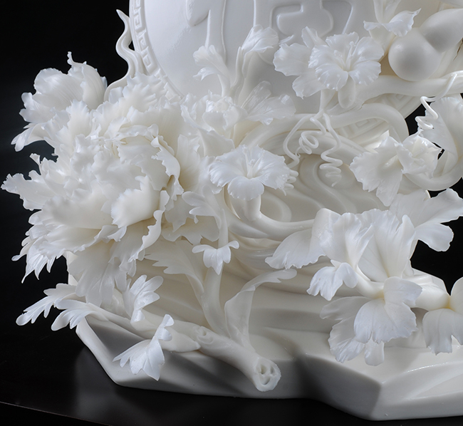 作品是采用高嶺土為制作材料,經(jīng)過原料研磨拌漿-濾泥-塑型-成型-晾干-素?zé)┯?釉燒等多道工藝制作流程,最終形成一件美輪美奐的瓷藝術(shù)作品。形象逼真地再生再現(xiàn)了牡丹花、葫蘆、枝干的形態(tài)、神韻、色彩和特殊寓意,立體陶瓷造型真實(shí)感強(qiáng),巧奪天工,相互映襯,相得益彰。