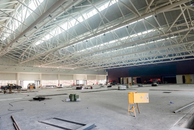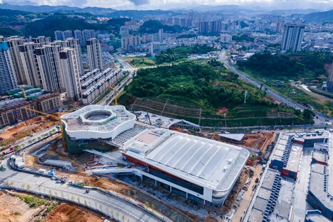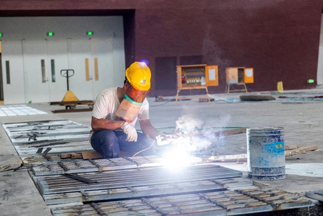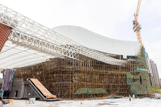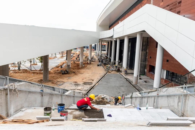 目前,博物館膜結(jié)構(gòu)屋面鋼構(gòu)施工、金屬鋁拉網(wǎng)屋面施工基本完成;外立面幕墻鋁板安裝完成80%;機(jī)電施工完成100%;跨路觀景大平臺(tái)頂棚及梁柱粉刷施工完成100%;金屬屋面完成100%;會(huì)展中心及輔助(附屬)用房外立面鋁板安裝完成100%,玻璃幕墻完成100%。室外景觀施工完成工程量80%。