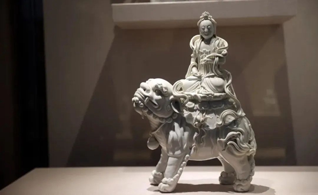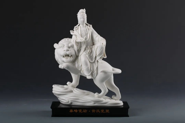 在國家級非遺傳承人、許氏瓷塑第六代傳人許瑞峰創(chuàng)辦的泰峰瓷坊展廳內,陳列著各式各樣精美的陶瓷藝術品。在展廳左側展柜,記者見到一尊騎著一頭獅子的菩薩,獅子四足直立,挺背抬頭、雙目仰望、表情威嚴,菩薩手持如意面目慈祥,雙腿盤坐于獅背上的蓮花座。“這是中國佛教四大菩薩之一的文殊菩薩,坐騎是一頭青獅。”許瑞峰介紹,這是許氏瓷塑第三代傳人許友義的作品,是許氏瓷塑有實物印證最早創(chuàng)作的“獅文化”作品。