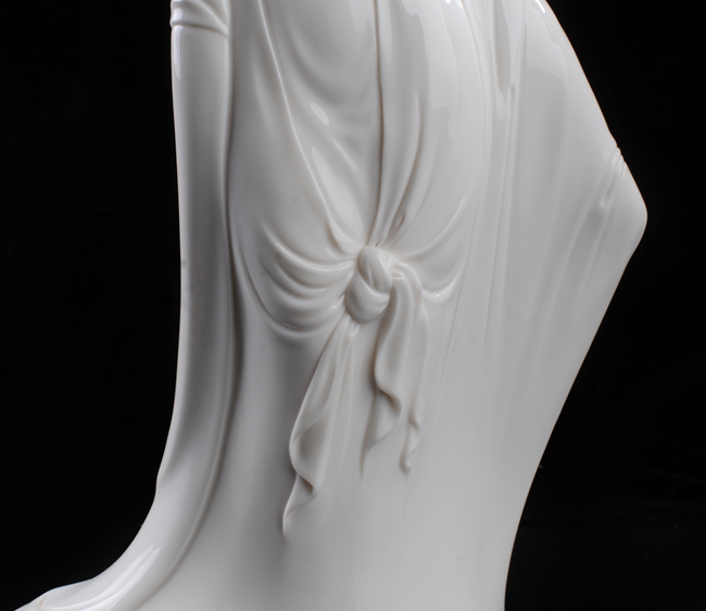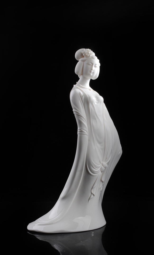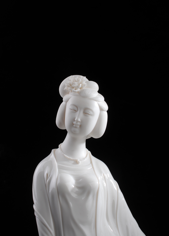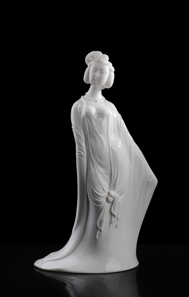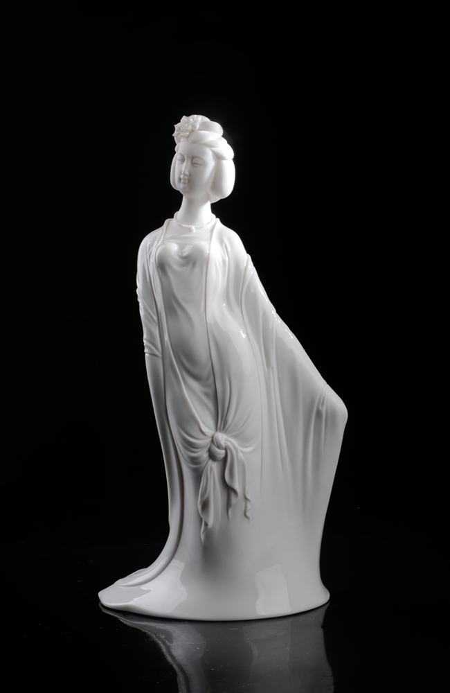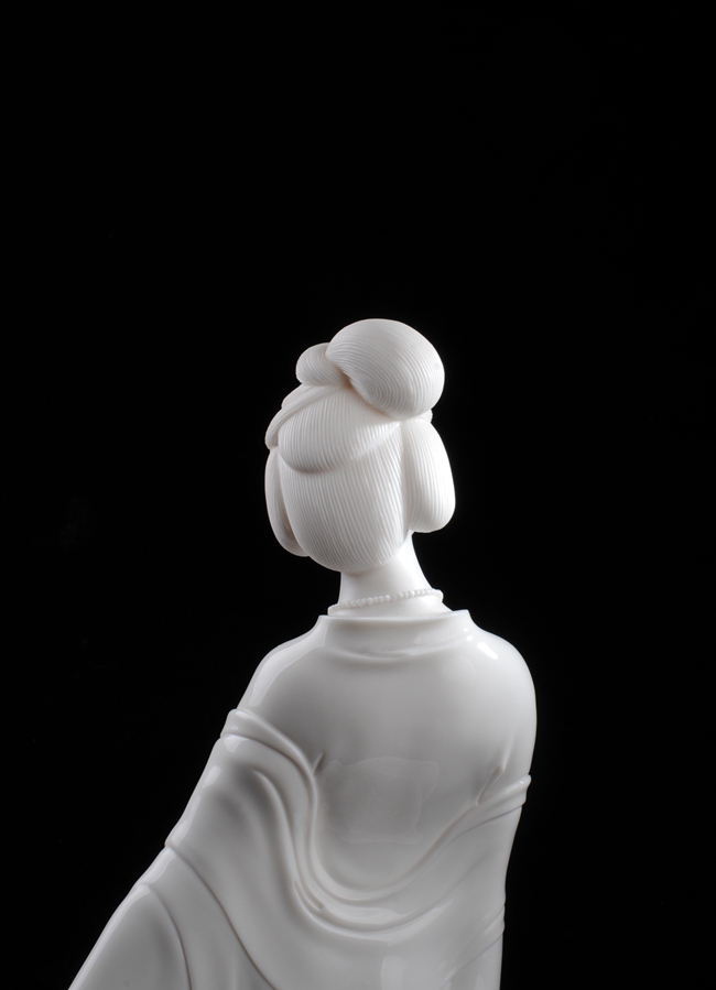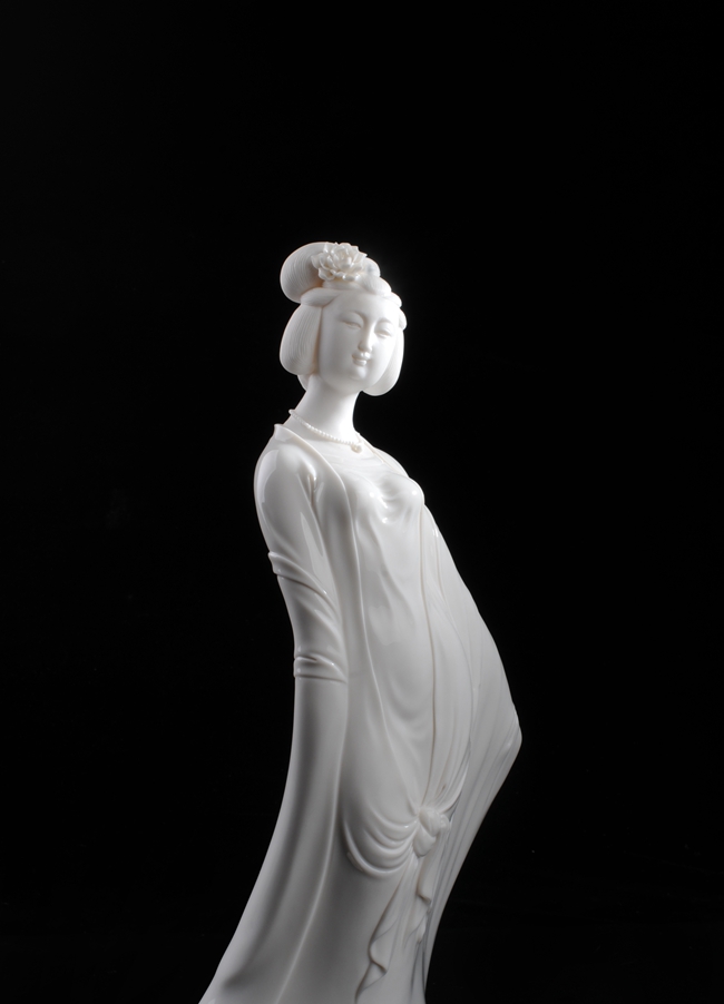 作品沿繼德化白瓷古法堆雕技藝,以白瓷溫潤細膩為胎質(zhì),表現(xiàn)楊貴妃皮膚如雪一樣白,吹彈可破,姿態(tài)柔美。