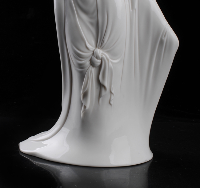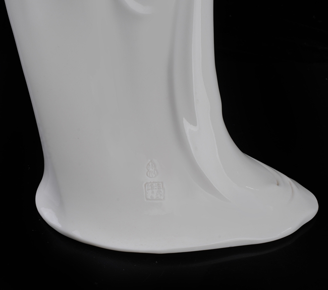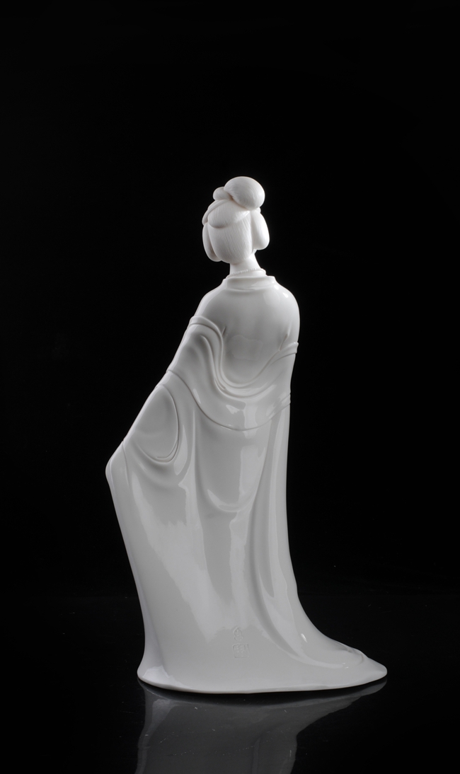 《玉環(huán)羞花》由全國技術能手李錦峰設計創(chuàng)作。作品以德化溫潤如玉的 “中國白”為胎質(zhì),經(jīng)1300多度高溫燒制,胎體溫潤如玉,瓷感細膩,宛若凝脂。作品創(chuàng)作中,作者不僅追求表象的唯美,更注重塑造人物的細節(jié)美。精心塑造出楊玉環(huán),體型微胖,但她皮膚如雪一樣白,吹彈可破,眼睛丹鳳眼,如櫻桃一般的小嘴,鼻子小巧,輕柔線條的簡約勾勒,衣飾增強人物的飄逸感,以簡勝繁,化動為靜,整個秀氣的形象,展現(xiàn)的淋漓盡致,使人物活靈活現(xiàn)。作品背面落有大師章款,兼具審美價值和收藏價值,是不可多得的雅作。是辦公、家居、書房裝飾擺設、禮贈、收藏的好選擇。