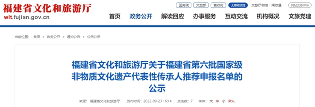 現(xiàn)將福建省第六批國家級非物質(zhì)文化遺產(chǎn)代表性傳承人推薦申報名單向社會公示,公示期自2022年9月23日至29日。