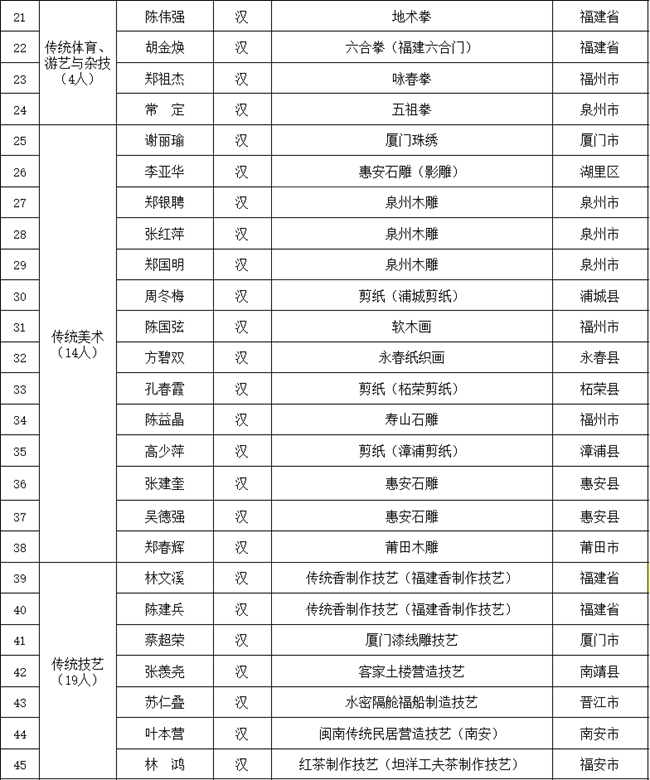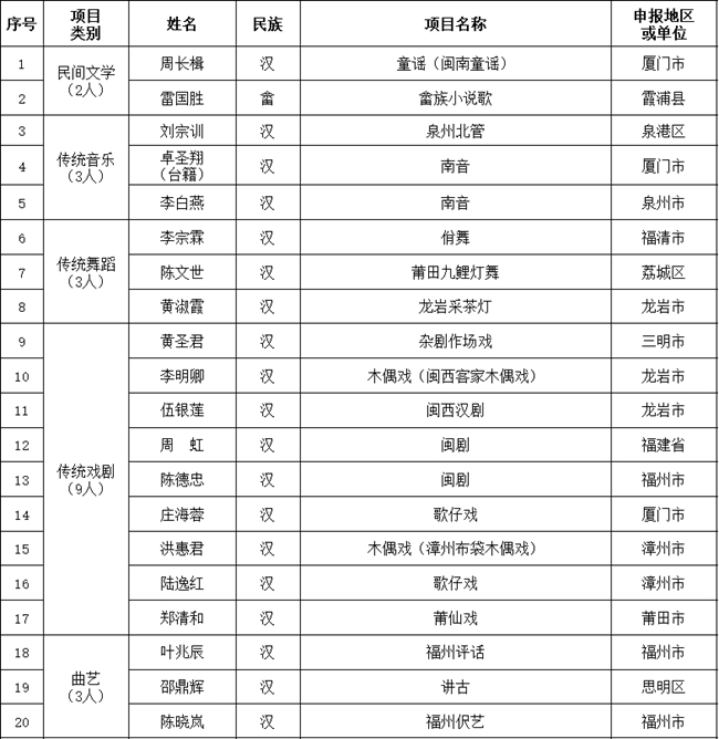 福建省第六批國家級非物質(zhì)文化遺產(chǎn)代表性傳承人推薦申報名單