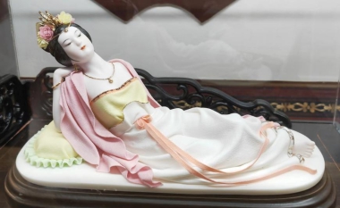 靜寂的展廳里,有這樣一座貴妃醉酒瓷像:璀璨燈光照耀下,貴妃側(cè)臥于玉床,雙頰粉嫩如朝霞,烏發(fā)傾瀉如飛瀑,一條絲綢披帛籠于雙臂,裙帶細如云絲。走近瓷像細看,才恍然大悟那披帛并非絲綢,而是由薄瓷制成,令人擊掌叫絕。