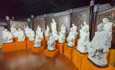 在德化,擁有如此規(guī)模、自成體系、飽含深厚中華文化底蘊瓷像藏品的藏館,僅此一家。除四大名著外,邱雙炯還化用了儒學、佛教、道教等傳世典故,研制出《和諧十八羅漢》、五百羅漢等精美瓷雕塑像。其中,五百羅漢作品被德化縣陶瓷博物館專設展廳收藏,在它們身上,白瓷塑像與中華優(yōu)秀傳統(tǒng)文化完成了精彩的融合。