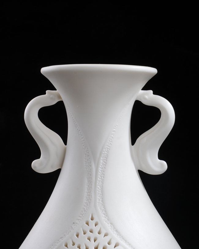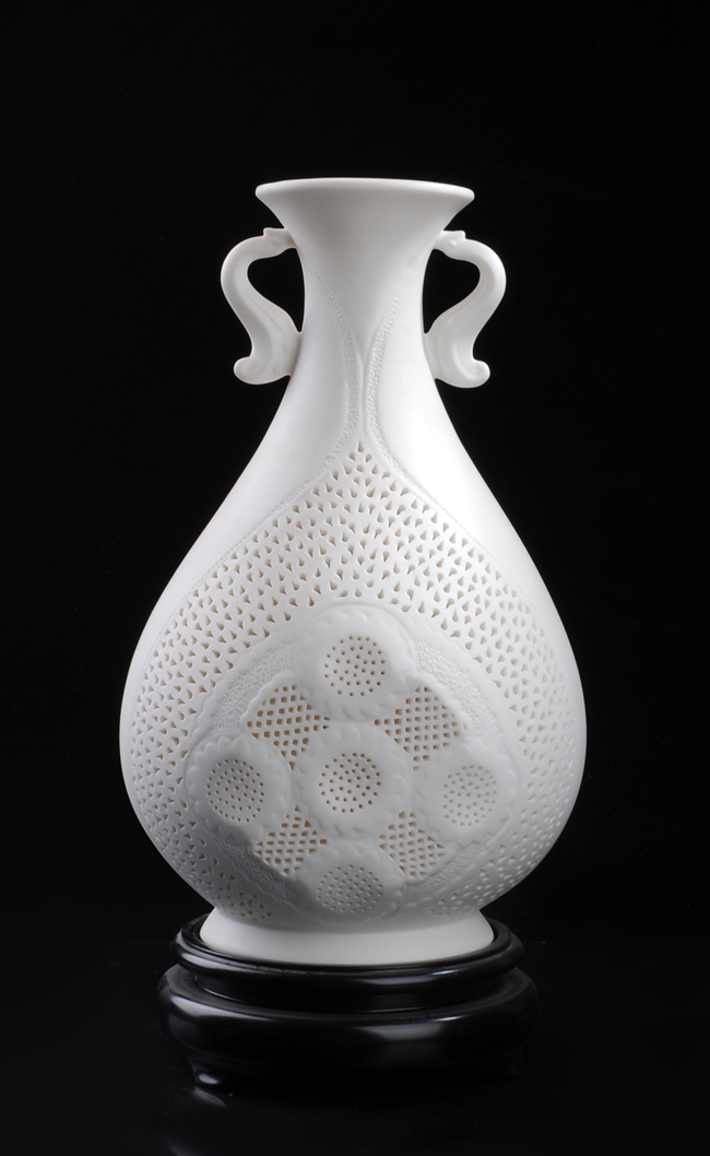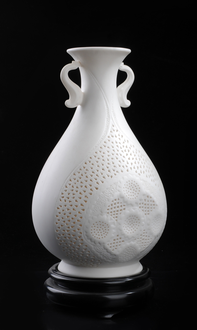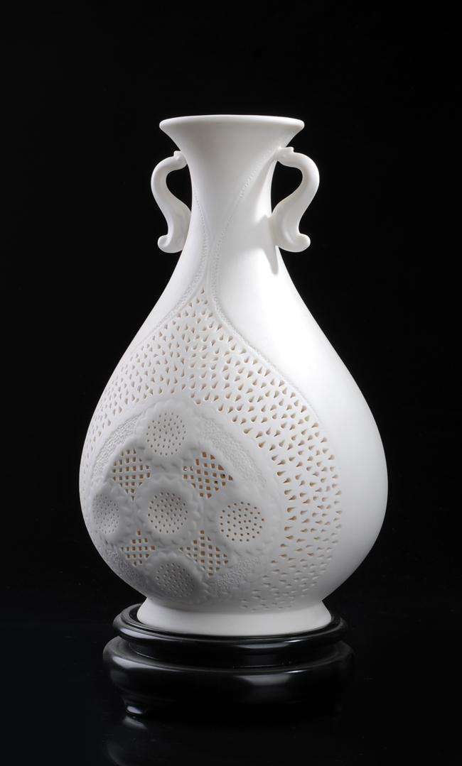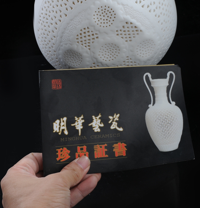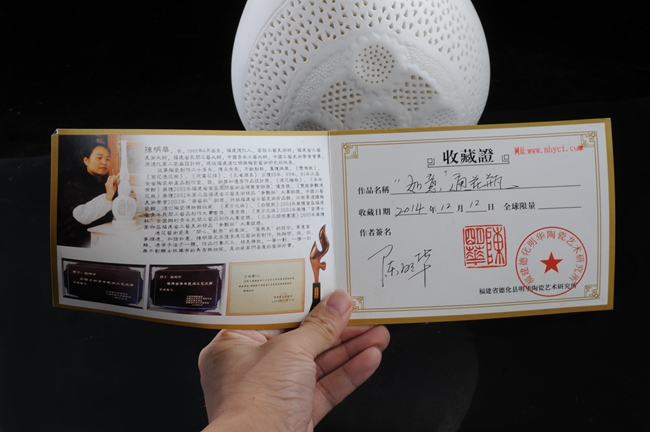 《如意通花》由中國陶瓷藝術大師陳明華設計創(chuàng)作。作品以德化溫潤如玉的 “中國白”為胎質(zhì),經(jīng)1300多度高溫燒制,作品設計巧妙,雙耳以如意為造型設計,線條流暢富有動感,制作手法精妙、工序復雜,仿似在瓷中“剪紙”,瓷上“飛花”。整體清秀唯美,創(chuàng)意感足,作品底部落有大師手刻簽落款,兼具審美價值和收藏價值,是不可多得的雅作。是辦公、家居、書房裝飾擺設、禮贈、收藏的好選擇。