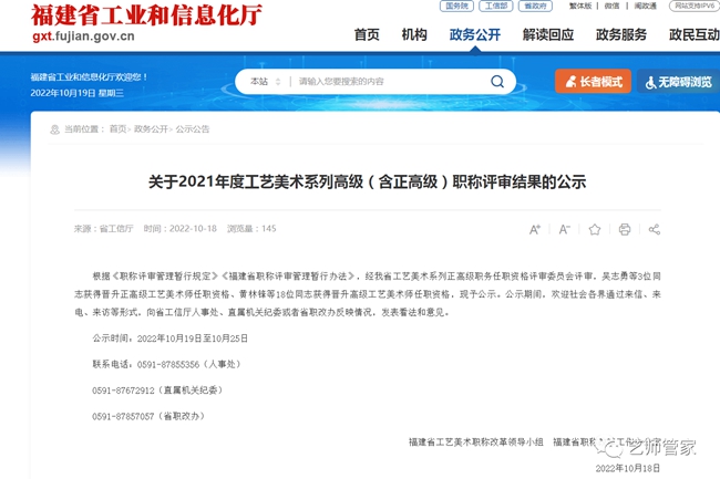 2022年10月18日,福建省工業(yè)和信息廳官網(wǎng)正式公布2021年度工藝美術系列高級(含正高級)職稱評審結(jié)果,其中吳志勇等3位同志獲得晉升正高級工藝美術師,黃林鋒等18位同志獲得晉升高級工藝美術師。