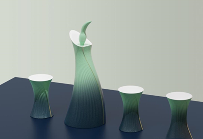 設(shè)計(jì)說明:只此青綠分酒器造型靈感來源舞蹈詩劇《只此青綠》,整體造型宛若舞者衣袂翩翩,以當(dāng)代的表達(dá)方式敘述悠遠(yuǎn)綿長的傳統(tǒng)文化意境。千里江山青綠的漸變釉色配合條紋的造型讓人感受到虛實(shí)交錯(cuò)的美感。頂部放大的壺嘴讓酒更容易倒入瓶內(nèi);延長的壺嘴使出斷水利落卻細(xì)膩,便于分酒。