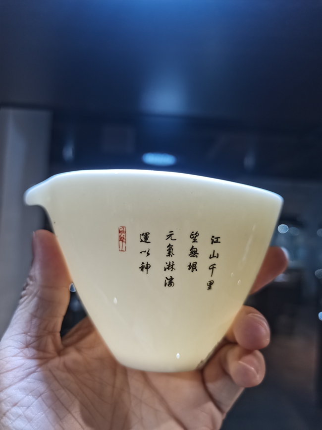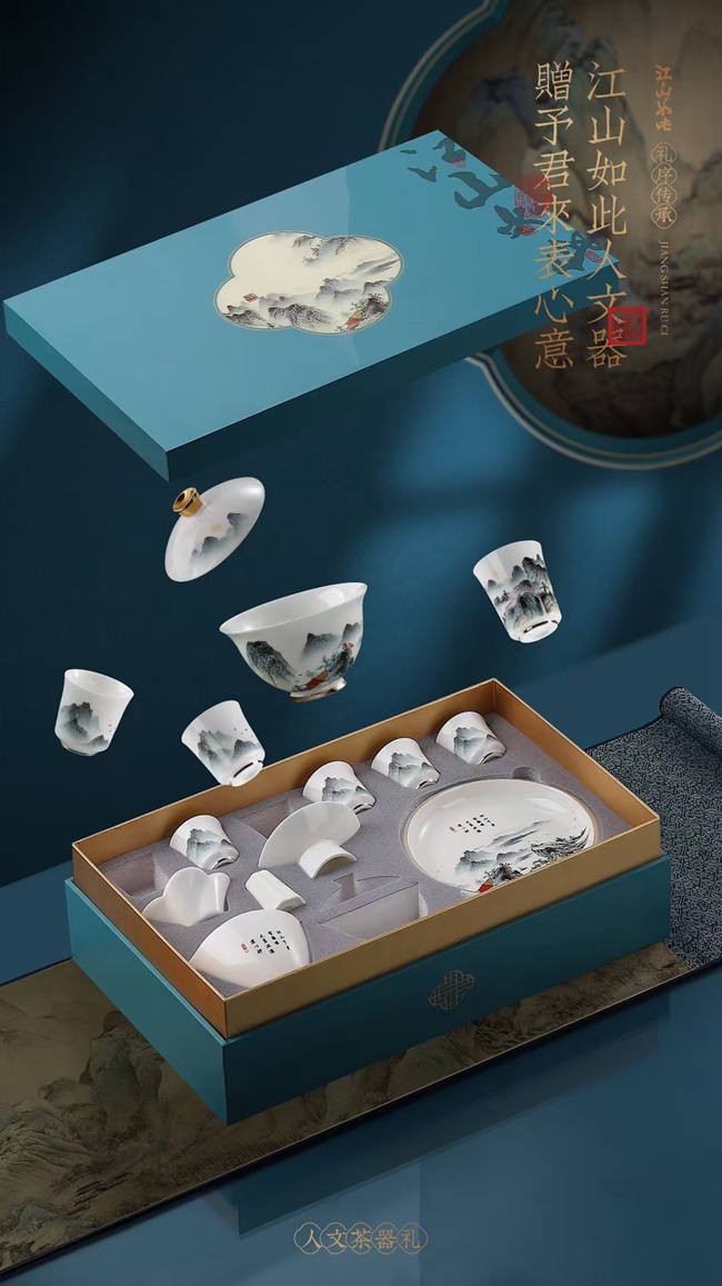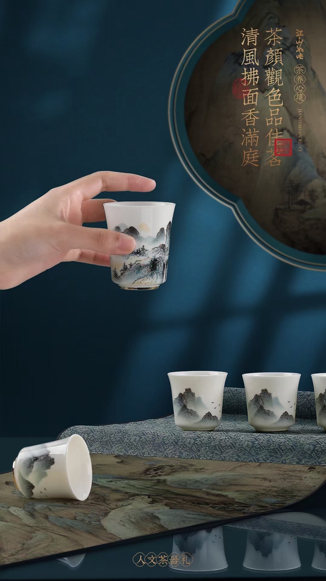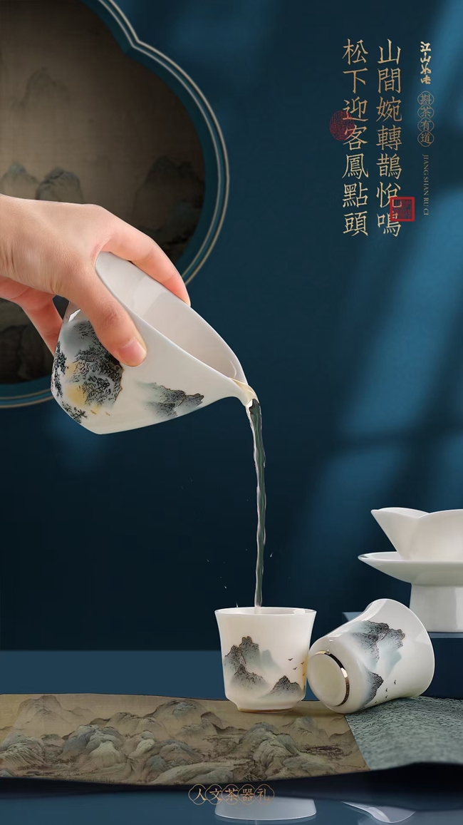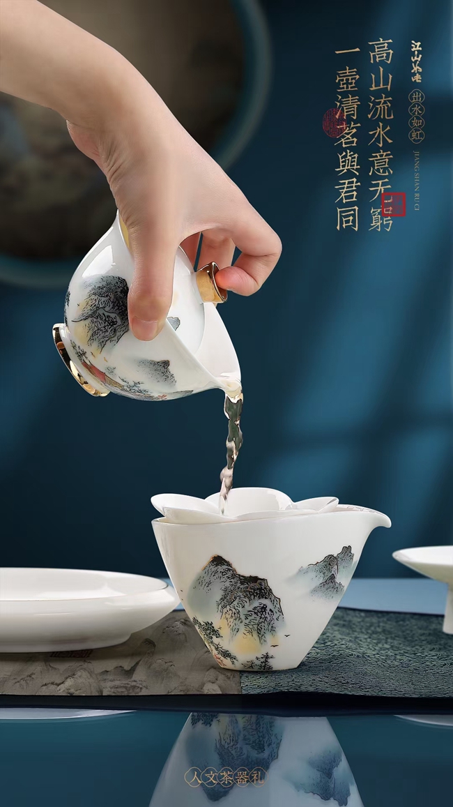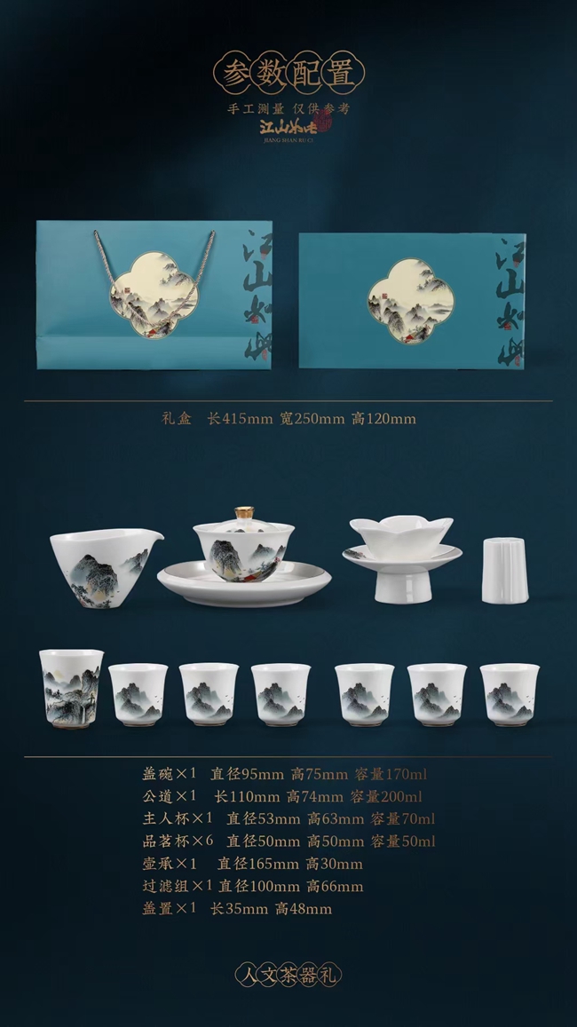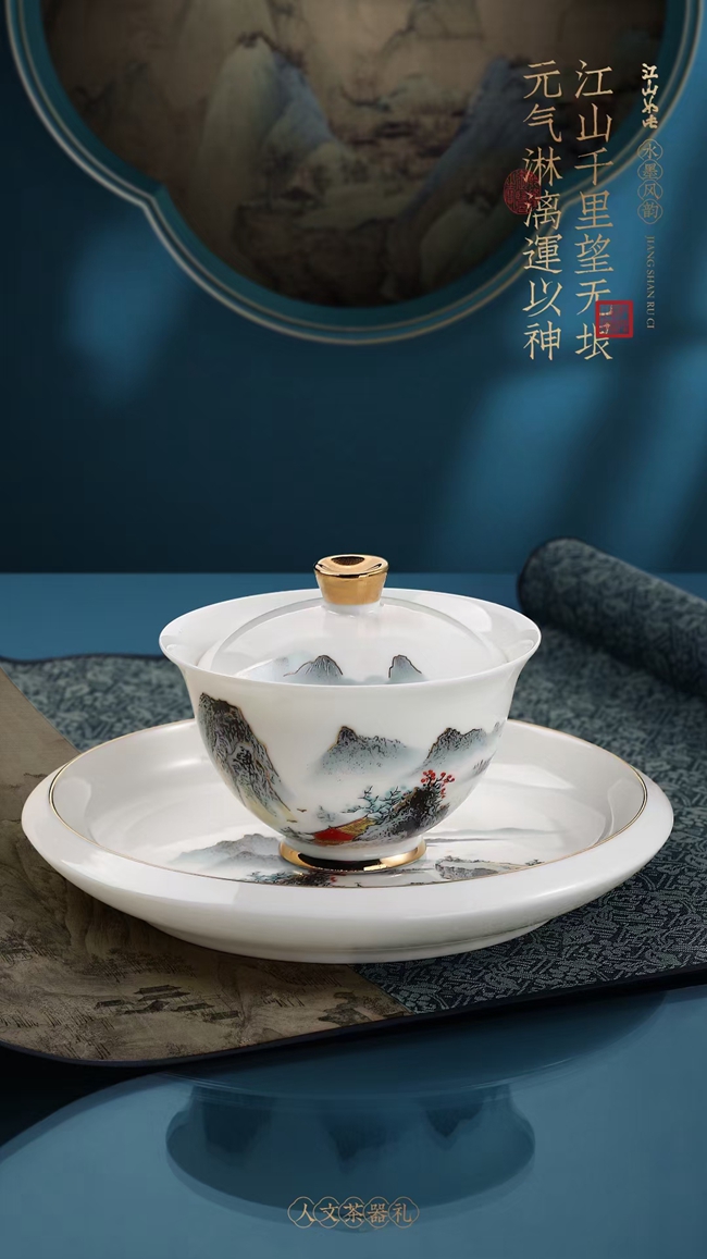 江山如此羊脂玉茶具器由工藝美術(shù)大師設(shè)計(jì),精選優(yōu)質(zhì)高嶺土,經(jīng)加工1300多度高溫?zé)贫,其瓷質(zhì)溫潤(rùn)似玉、透光性強(qiáng),胎骨潔白,作品采用手工堆金描金工藝,采用中國(guó)水墨山水畫設(shè)計(jì),瓷坯為紙,匠心手繪,筆觸瀟灑,意境水墨畫,鎏金點(diǎn)綴,品質(zhì)尊貴,禮盒包裝上檔次,是品茶、家居、禮品好選擇。