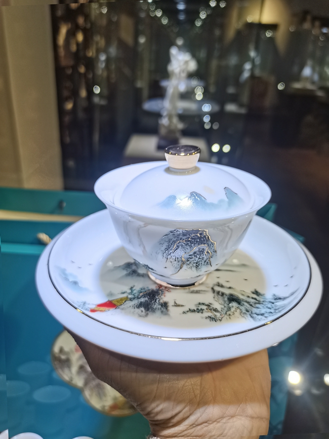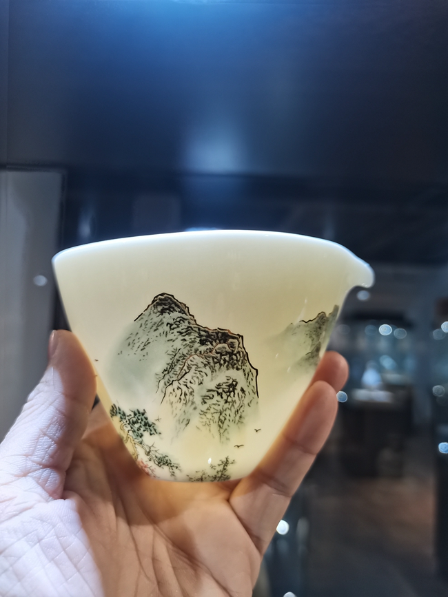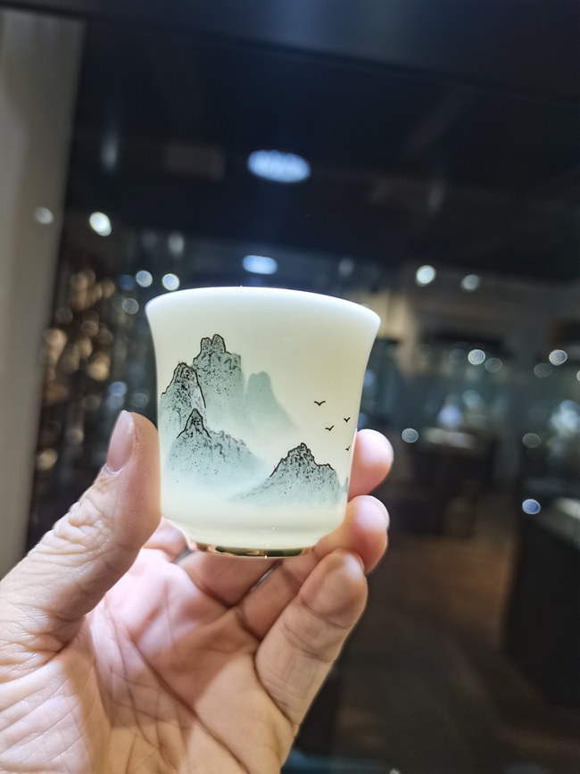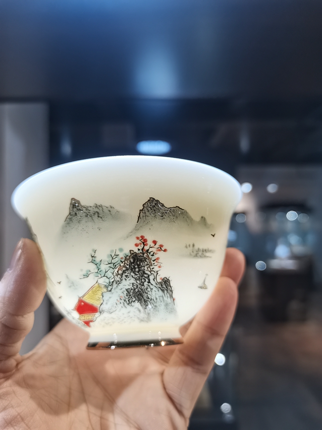 手工描繪江山圖,鎏金工藝點(diǎn)綴,金絲環(huán)繞,燒制后精美圖案展示在眼前,杯底邊沿描金點(diǎn)綴,金光熠熠,美觀大氣,十分驚艷。